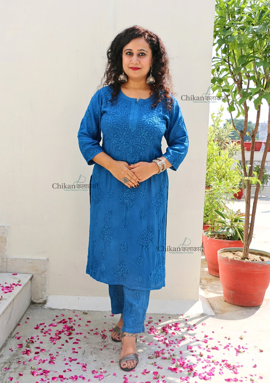 Aafreen Muslin Chikankari Kurti & Palazzo Set is a timeless classic designed from muslin cotton fabric for a luxuriously soft feel. Its beautiful hand embroidery and gorgeous color make it the perfect pick for any occasion. This hand-embroidered chikankari kurti set embodies timeless grace and modern charm.