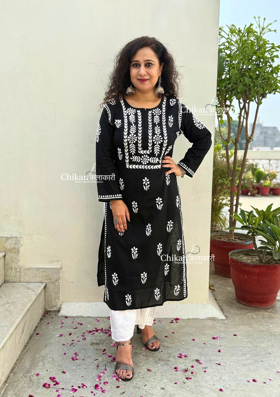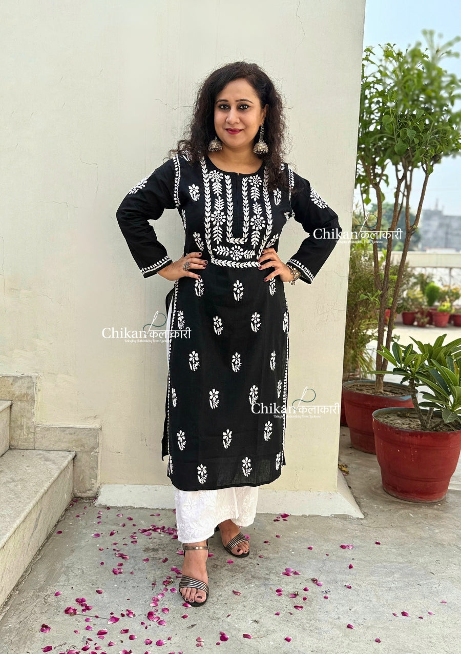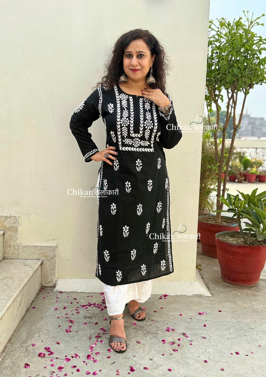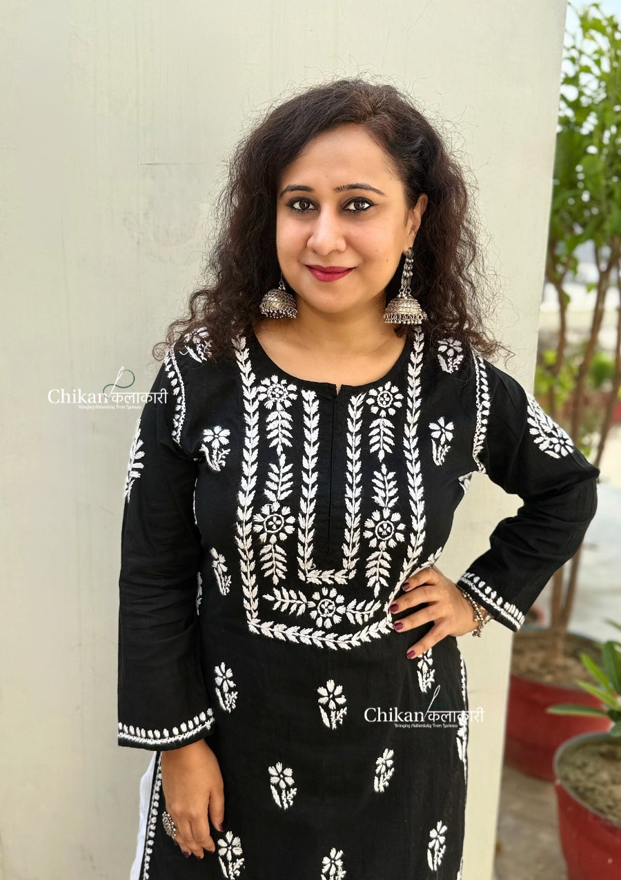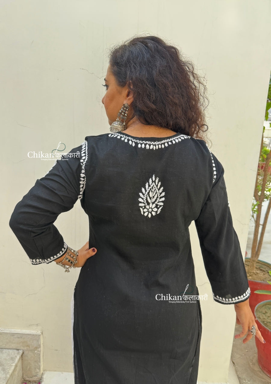 Style Tip: Pair Aalia Pure Cotton Black Chikankari Kurti with cotton chikankari pants or palazzo for a chic look!