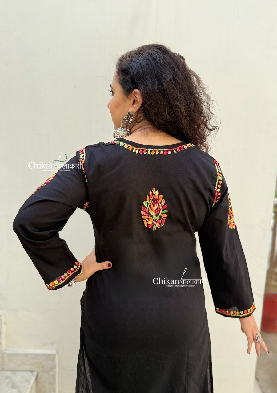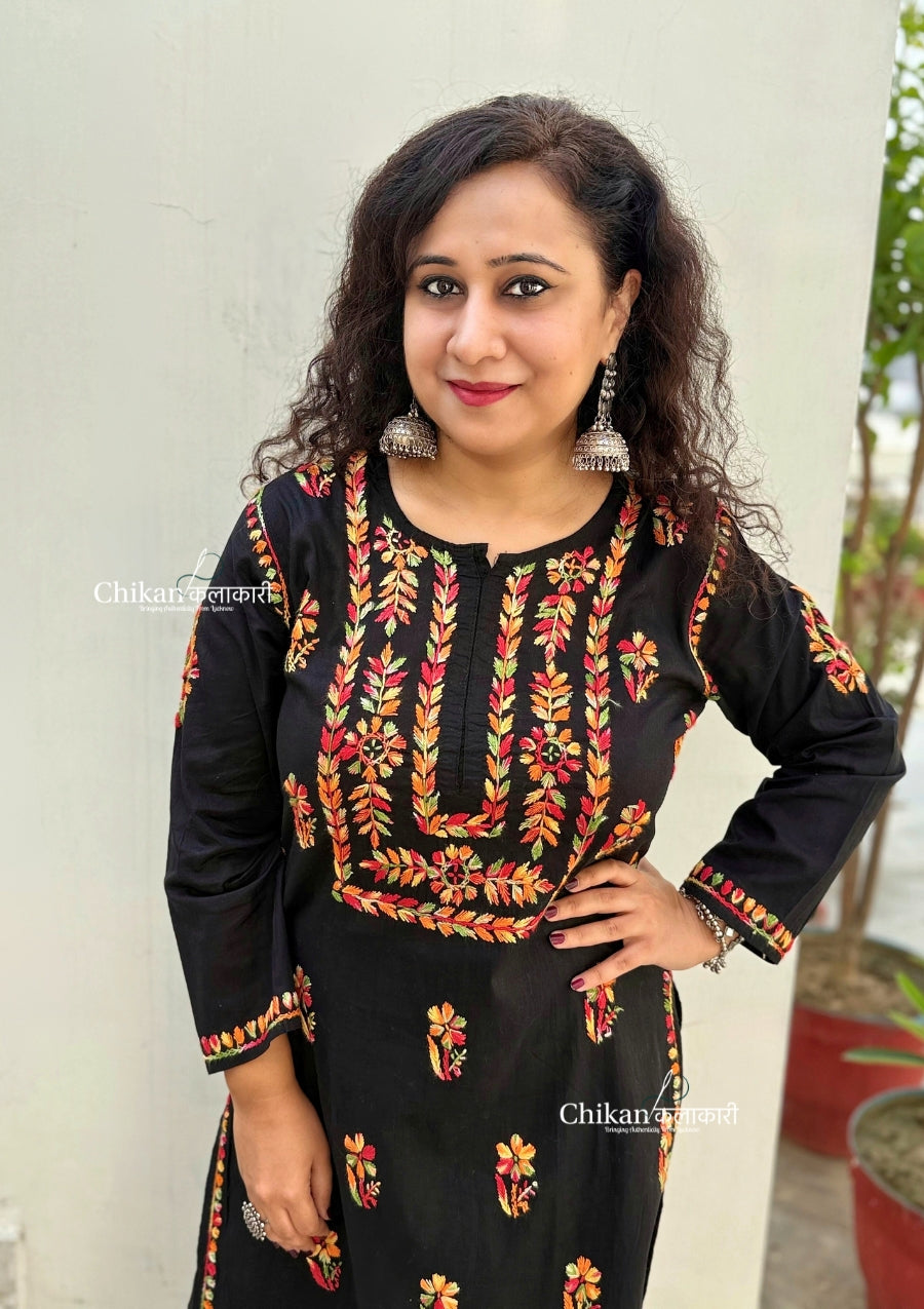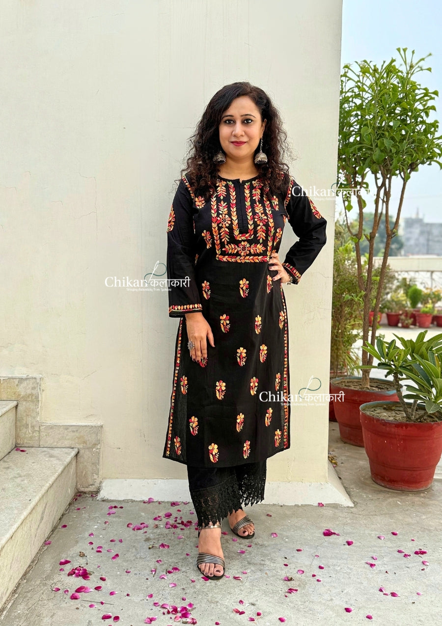 Look effortlessly cool and chic in Aalia Pure Cotton Black Chikankari Kurti. Crafted with soft cotton and detailed with multi-colored hand-embroidered chikankari, this piece will look beautiful and graceful. The lightweight fabric is both comfortable and breathable for all-day wear. Show off your unique fashion sense with this timeless wardrobe staple!