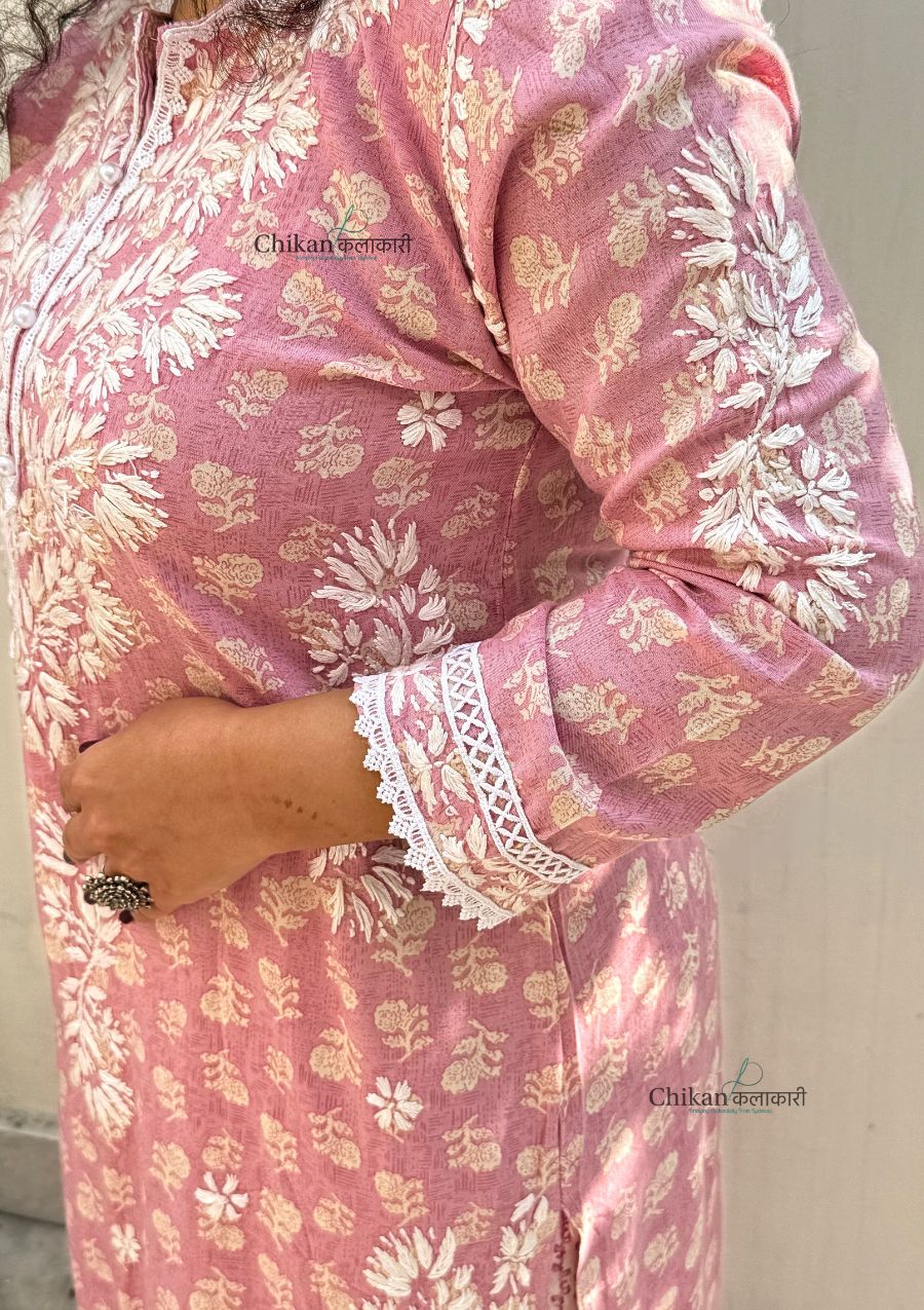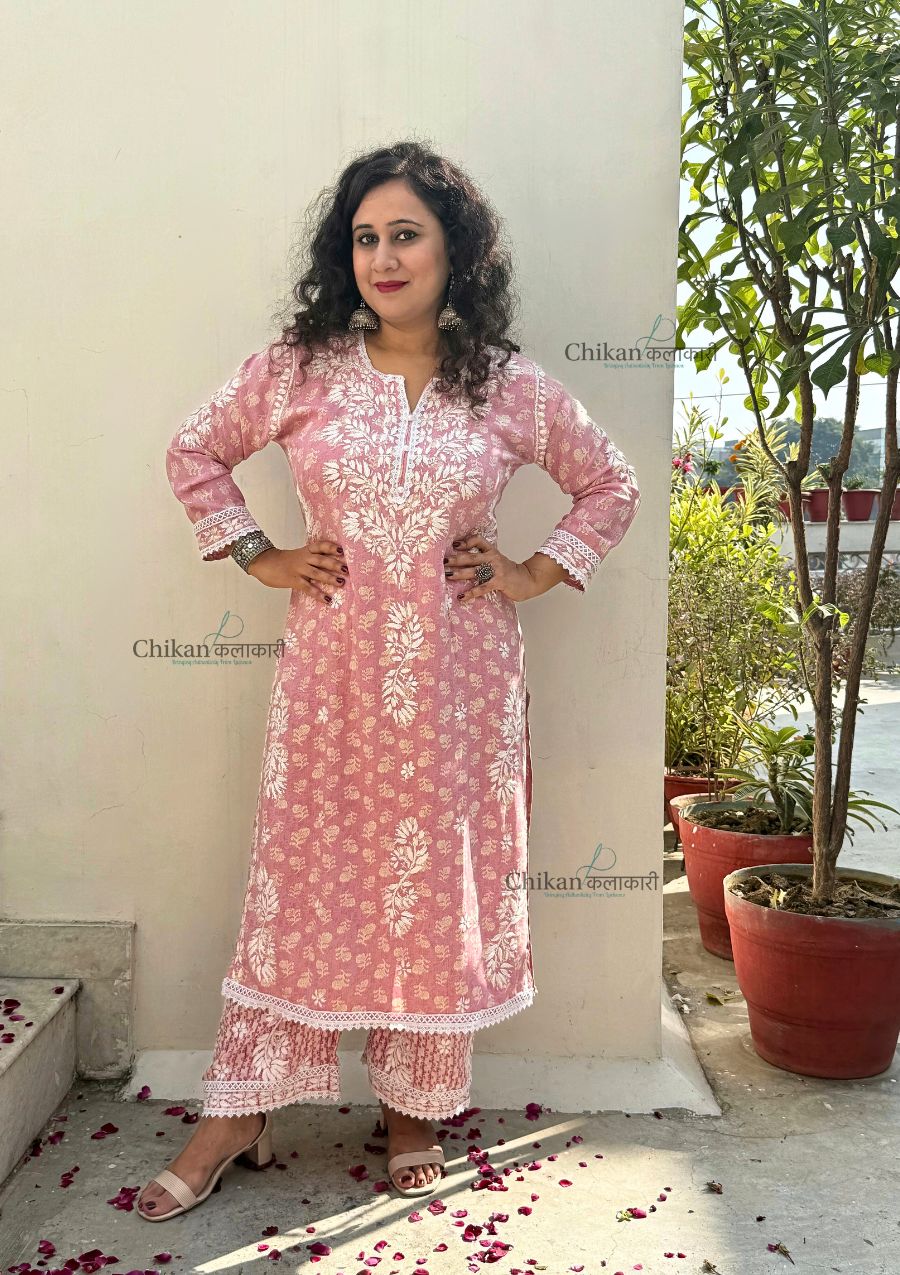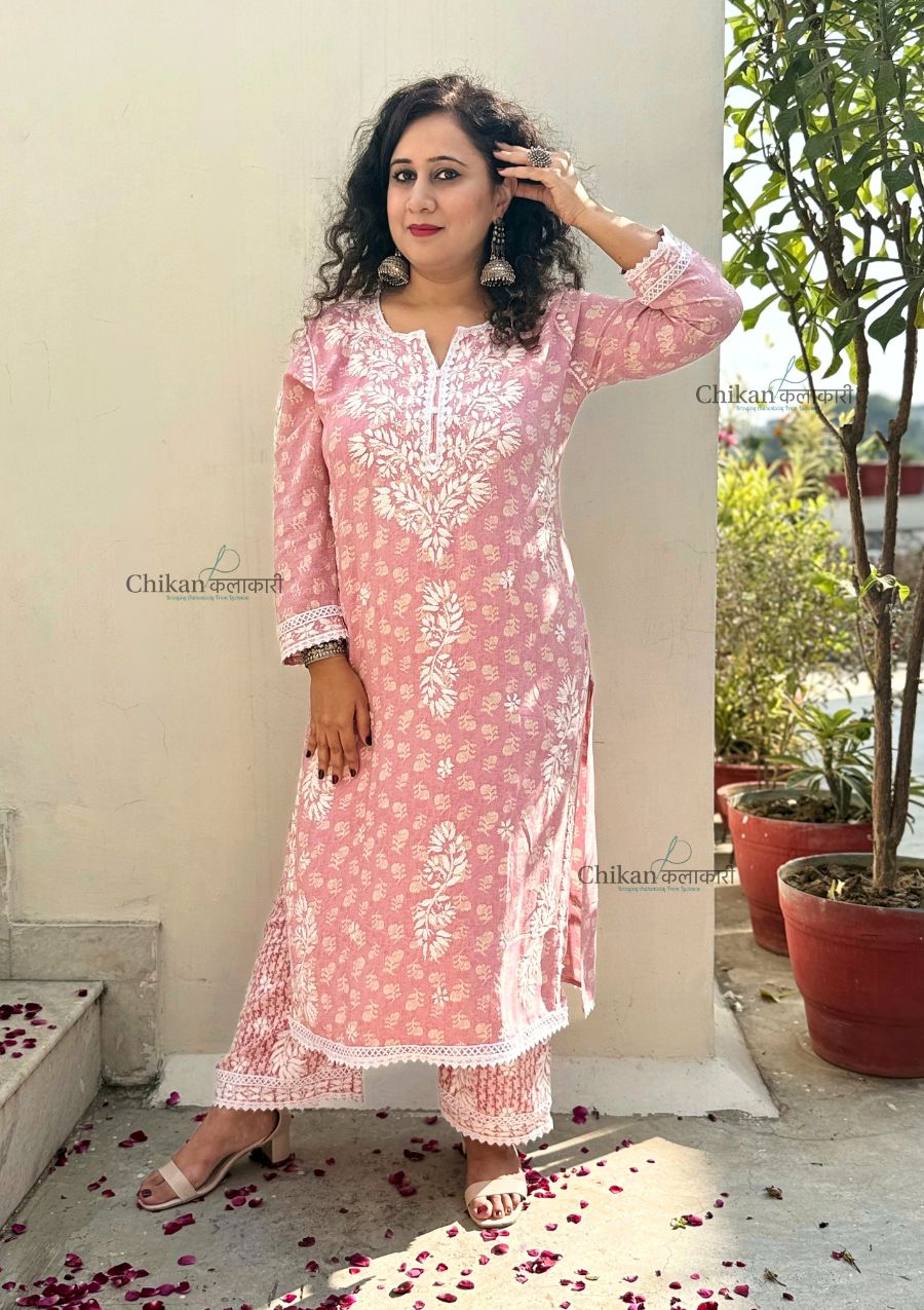 This Amira Printed Rayon Chikankari Kurti Set is a beautiful printed outfit crafted with expert craftsmanship. It's produced using rayon fabric for effortless breathability and comfort. The intricate Chikankari hand embroidery and lace details add a graceful finishing touch for an elegant style. Perfect for office wear and occasion wear.