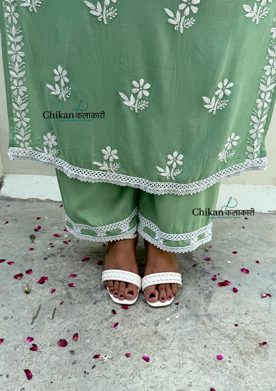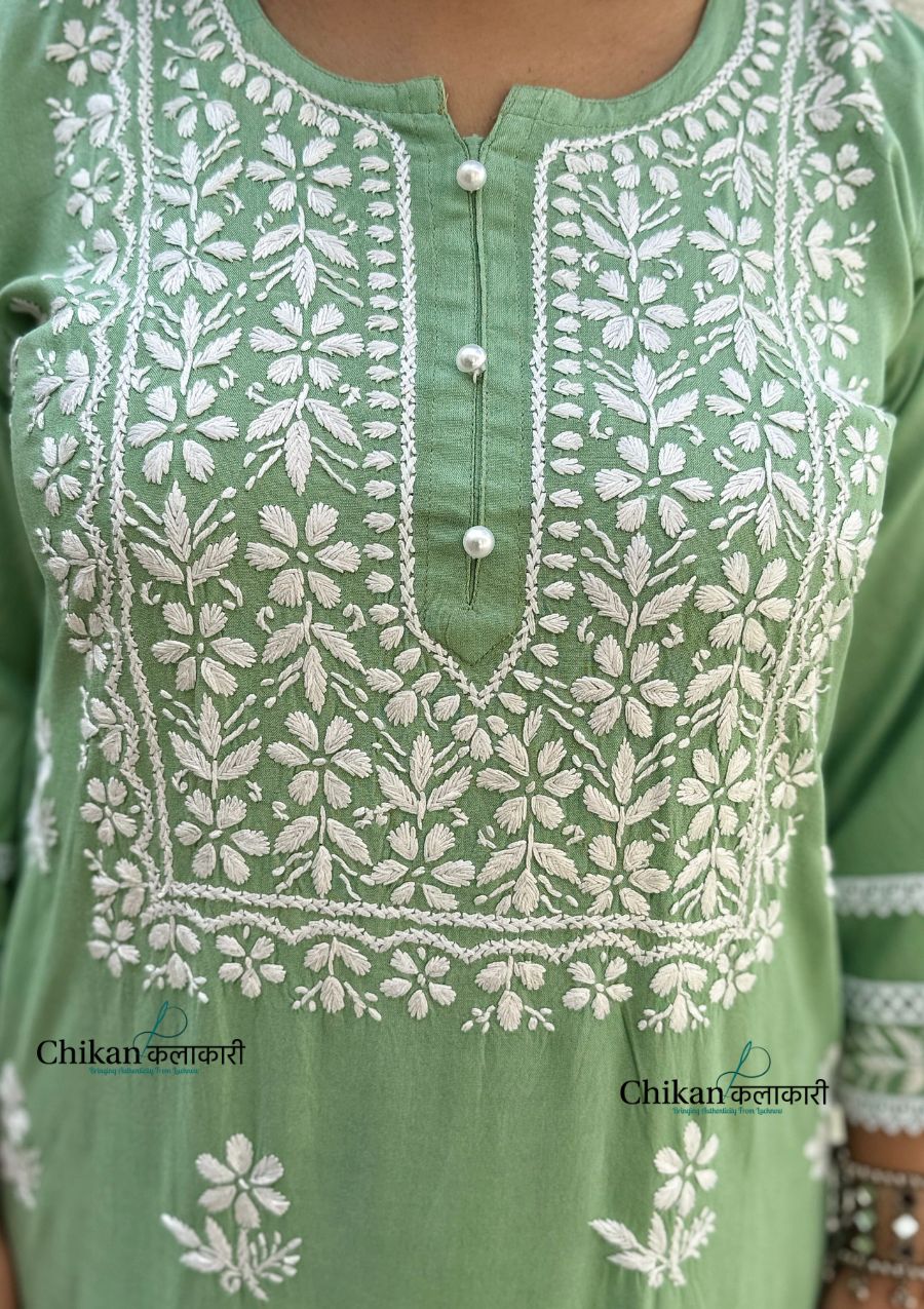 Arzoo Rayon Chikankari Kurti Set, made from soft rayon fabric, showcases exquisite Chikankari hand embroidery paired with elegant lace details. This designer Lucknowi Kurti Set is ideal for office wear, daily use, and special occasions, allowing you to make a sophisticated style statement while adding a timeless piece to your wardrobe.