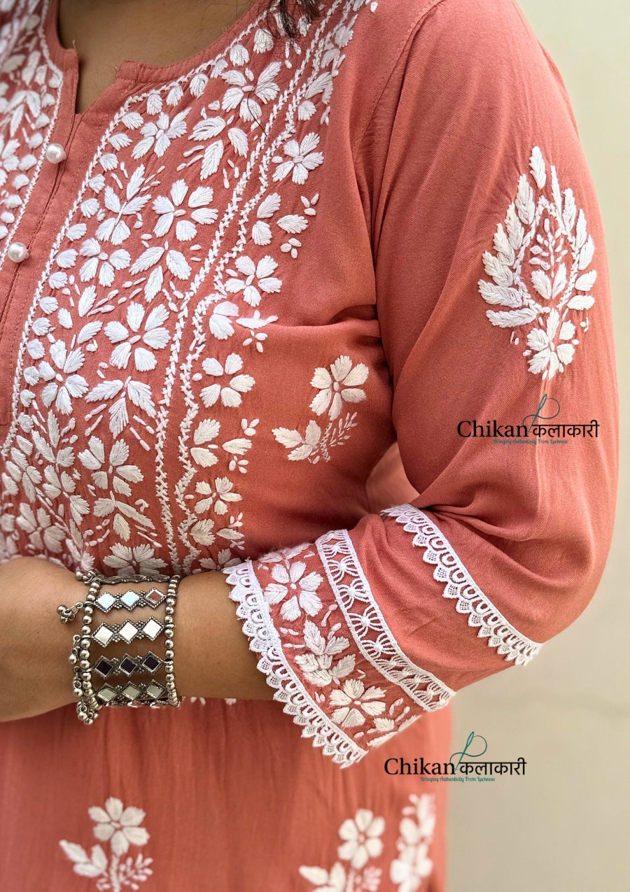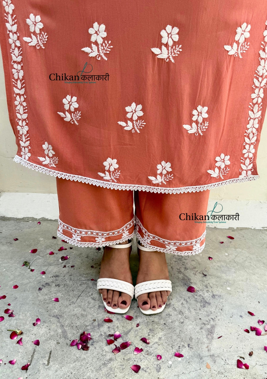 Arzoo Rayon Chikankari Kurti Set, made from soft rayon fabric, showcases exquisite Chikankari hand embroidery paired with elegant lace details. This designer Lucknowi Kurti Set is ideal for office wear, daily use, and special occasions, allowing you to make a sophisticated style statement while adding a timeless piece to your wardrobe.