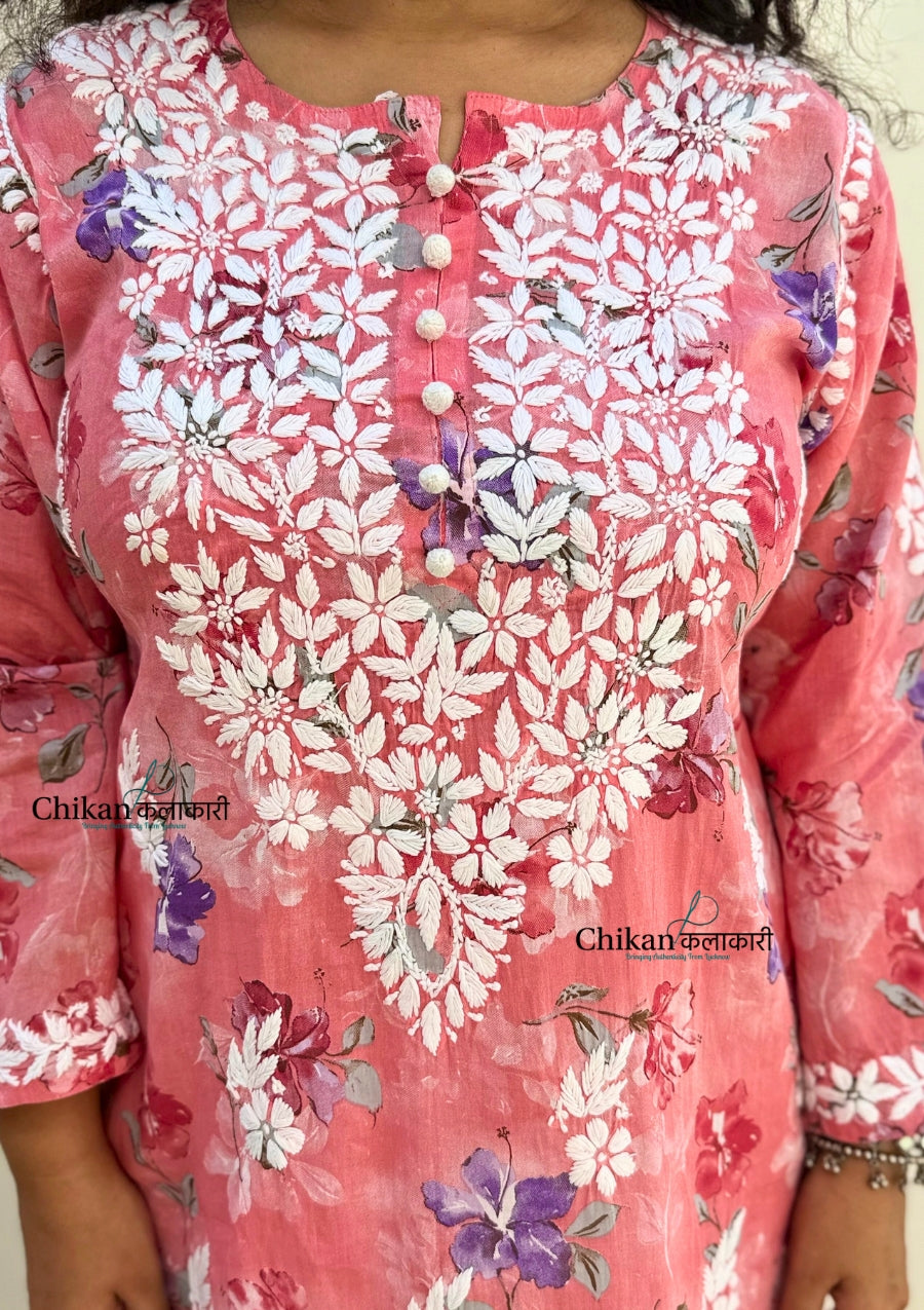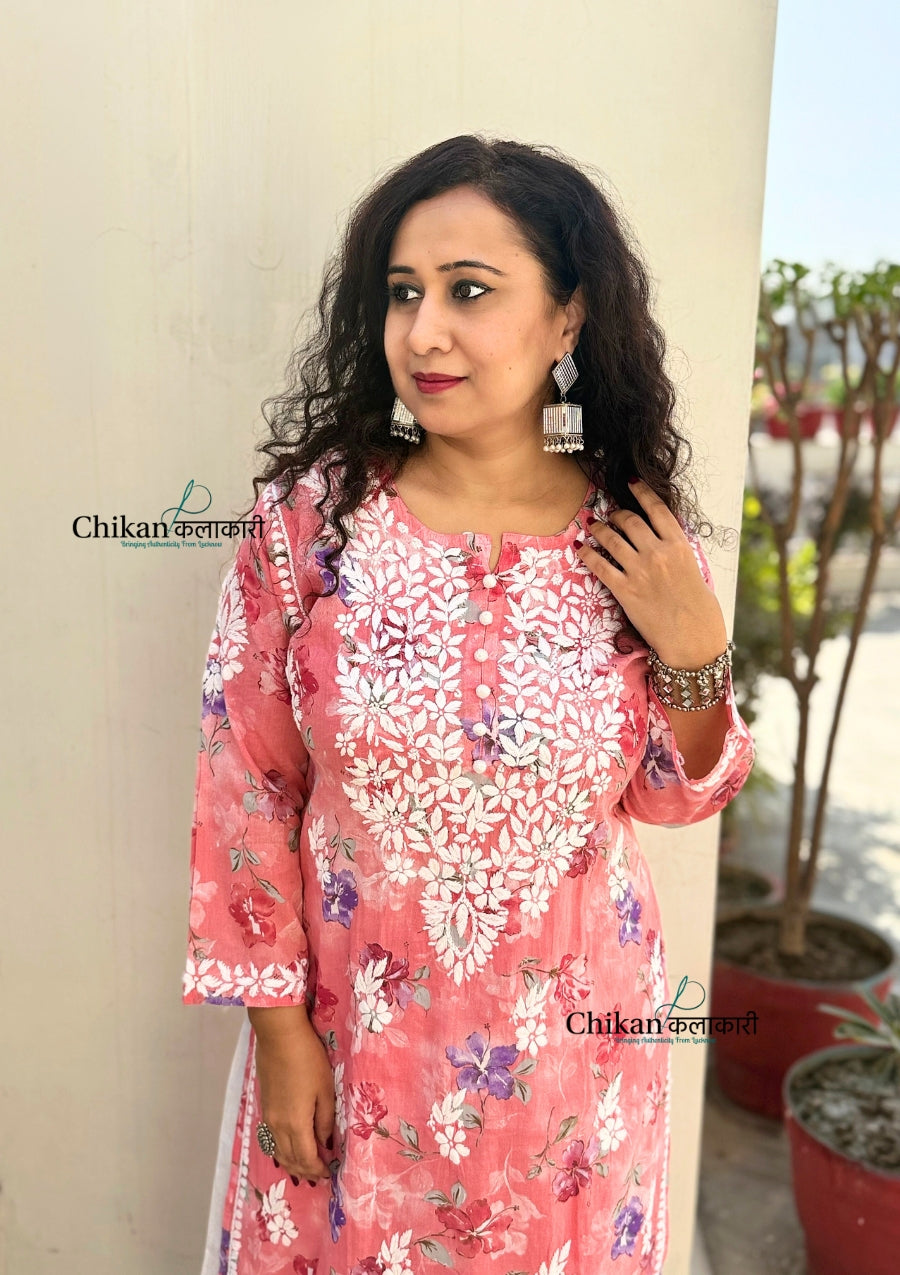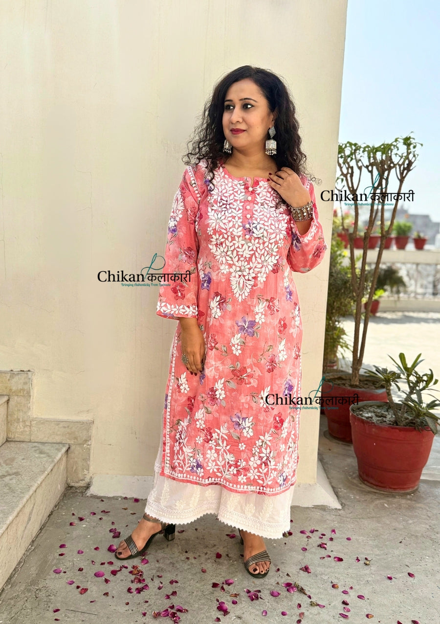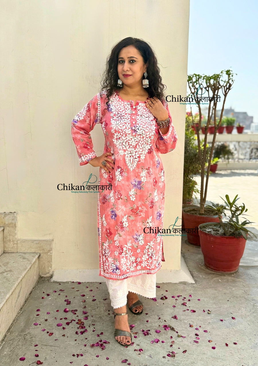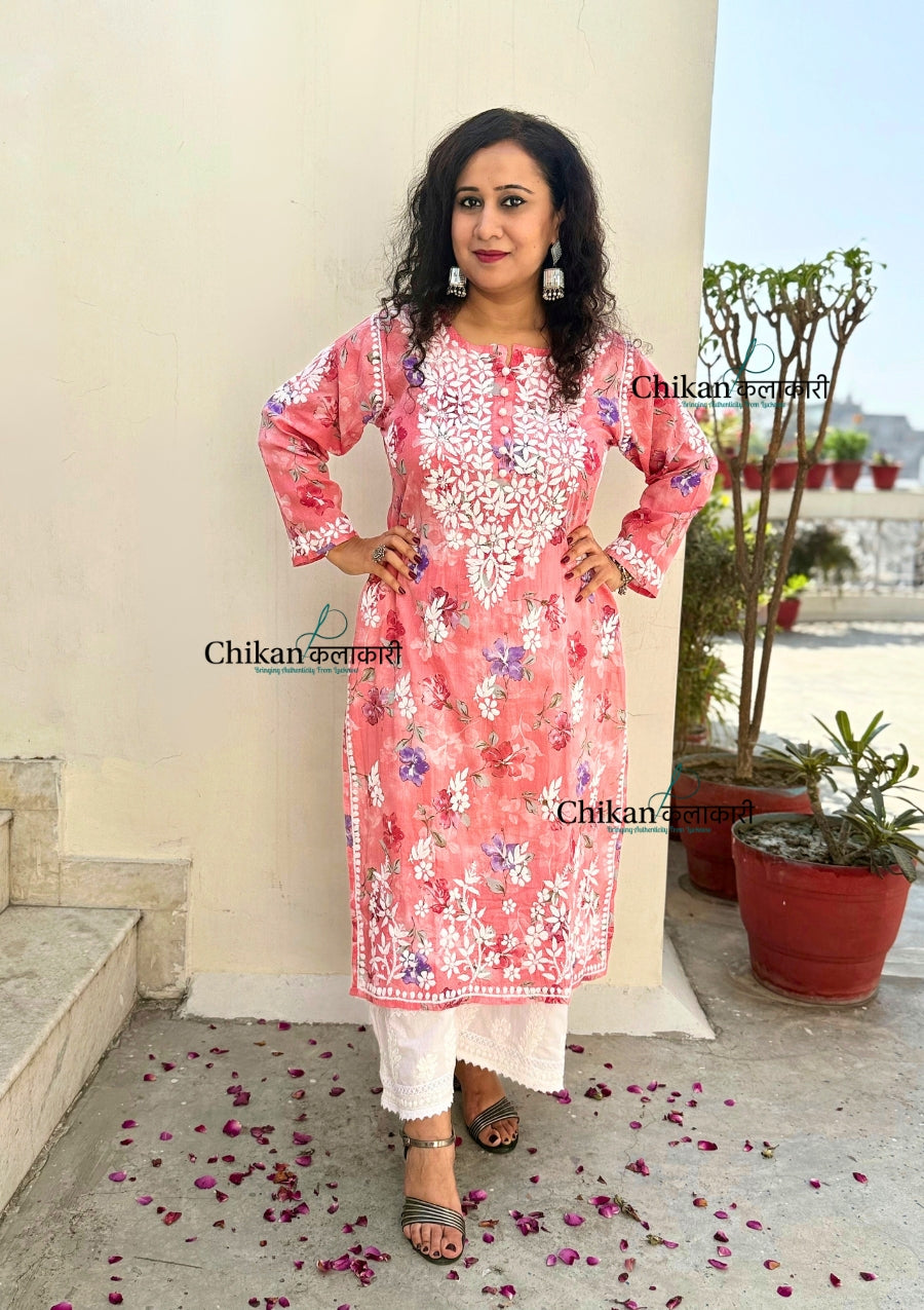 Falak Mul Cotton Chikankari kurti is expertly crafted with premium mul cotton fabric, adorned with a beautiful print, and meticulously hand-embroidered. Experience the luxurious feel of the fabric and the intricate details of the heavy hand embroidery, making it a perfect addition to your wardrobe. Elevate your style with this must-have piece.