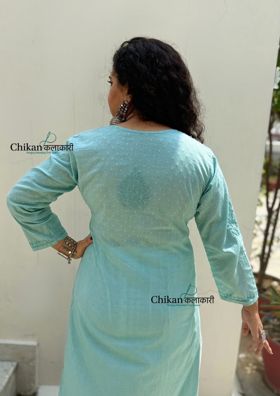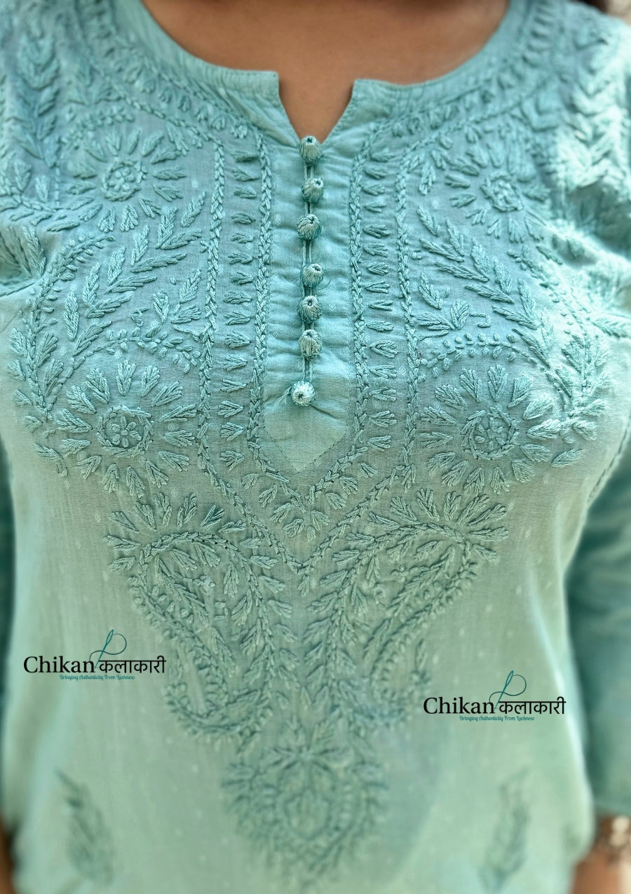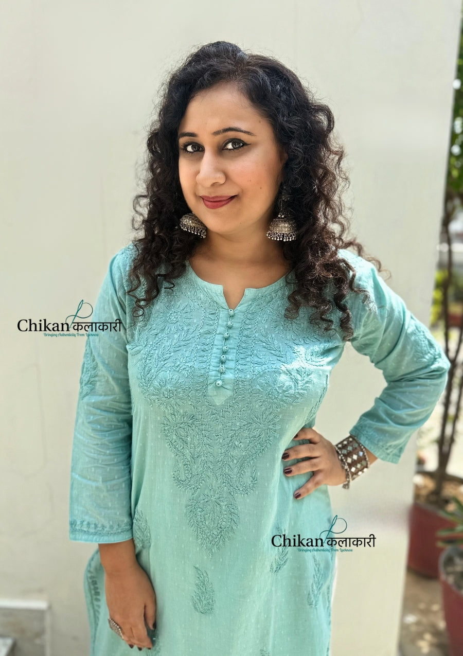 Firoza Cotton Chikankari Kurti is crafted from soft dobby cotton fabric, meticulously embroidered with traditional Chikankari hand embroidery. Renowned for its Lucknowi heritage, this kurti combines classic design with expert craftsmanship, ensuring lasting comfort and elegance.