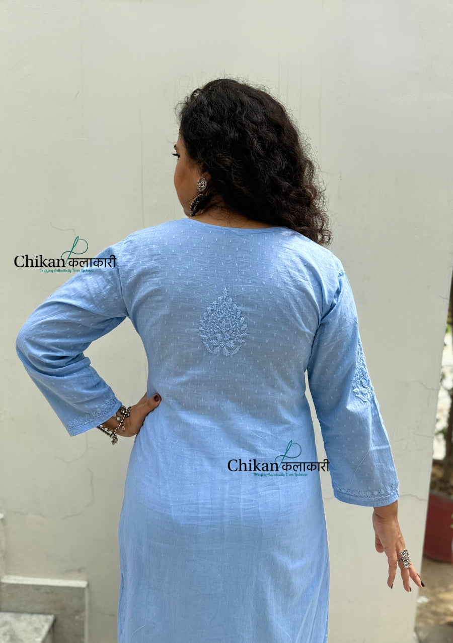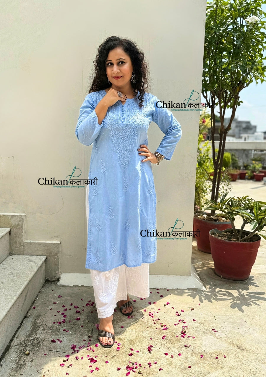 Firoza Cotton Chikankari Kurti is crafted from soft dobby cotton fabric, meticulously embroidered with traditional Chikankari hand embroidery. Renowned for its Lucknowi heritage, this kurti combines classic design with expert craftsmanship, ensuring lasting comfort and elegance.