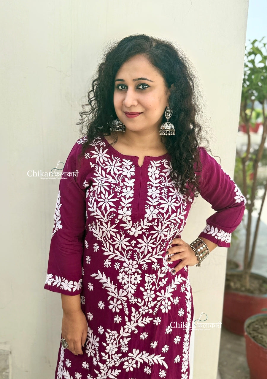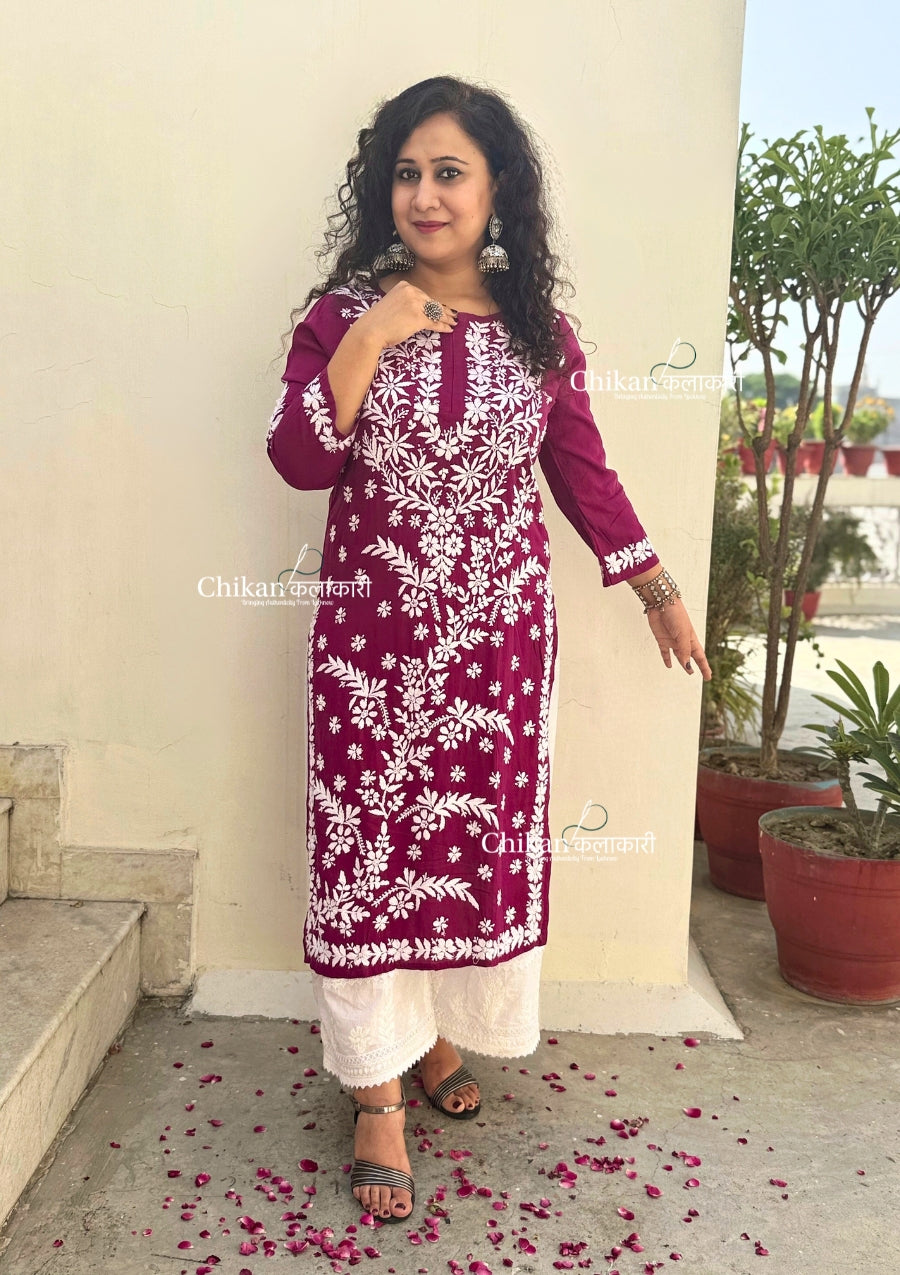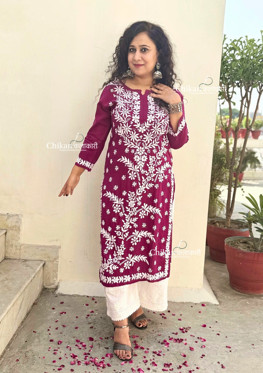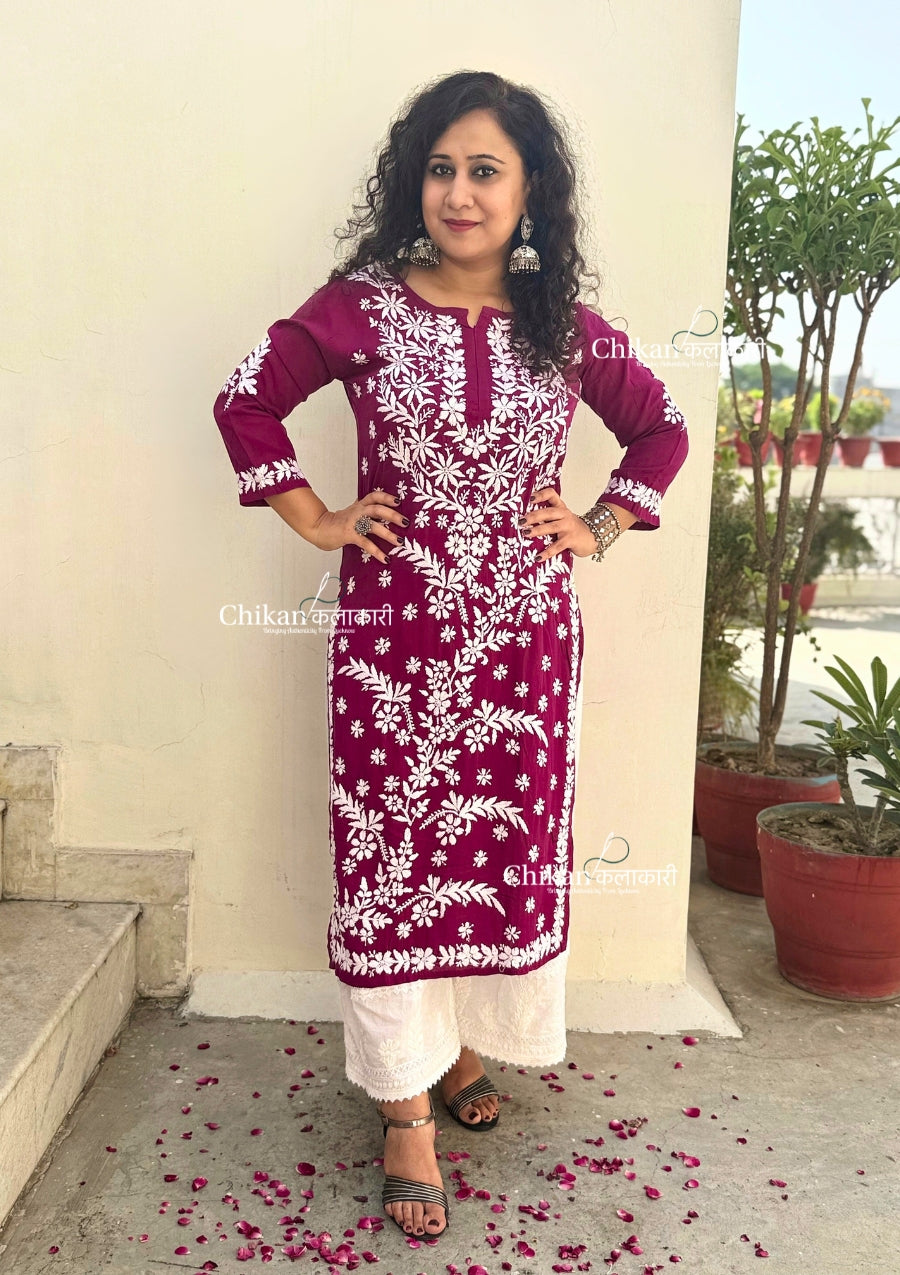 Our Heena Modal Chikankari Kurti is made of premium quality modal fabric and features intricate hand embroidery detail. Perfect for a formal or casual occasion, this elegant chikankari kurti is sure to turn heads.