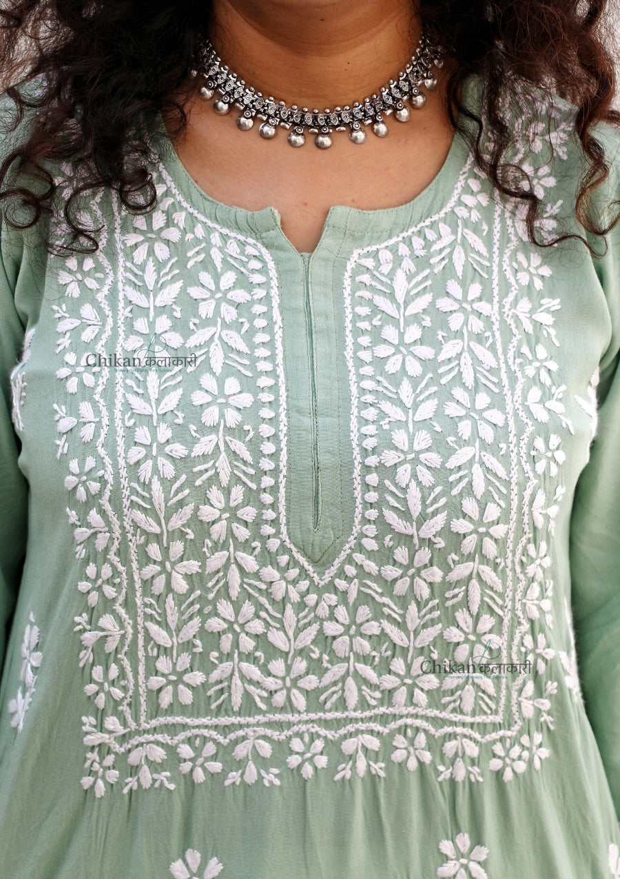 Iqra Chikankari Kurti is crafted from soft rayon fabric and features intricate Chikankari hand embroidery on front, back, and sleeves. This Lucknowi Chikankari Kurti is perfect for office, everyday, and special occasions, making it a must-have piece in your wardrobe.