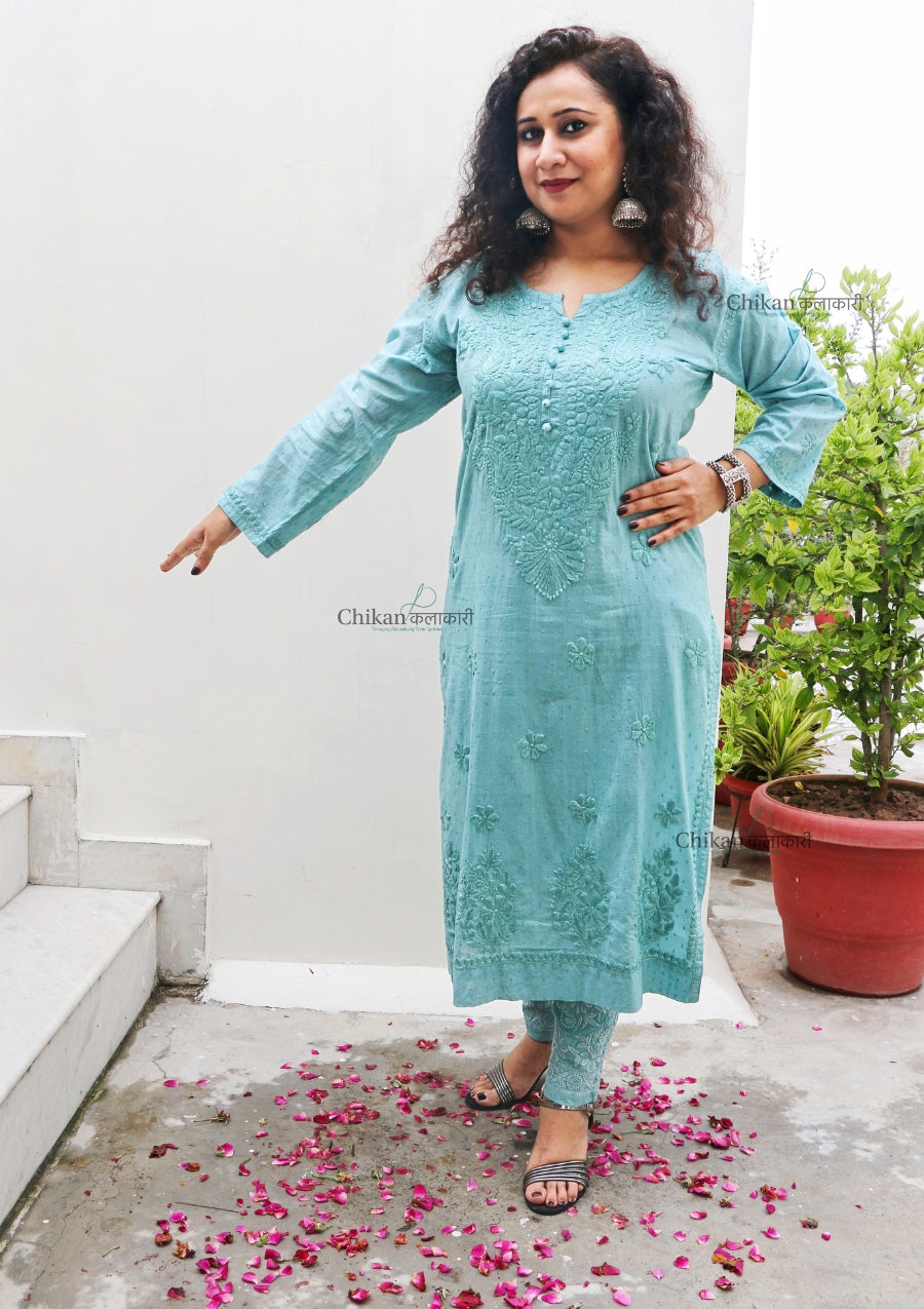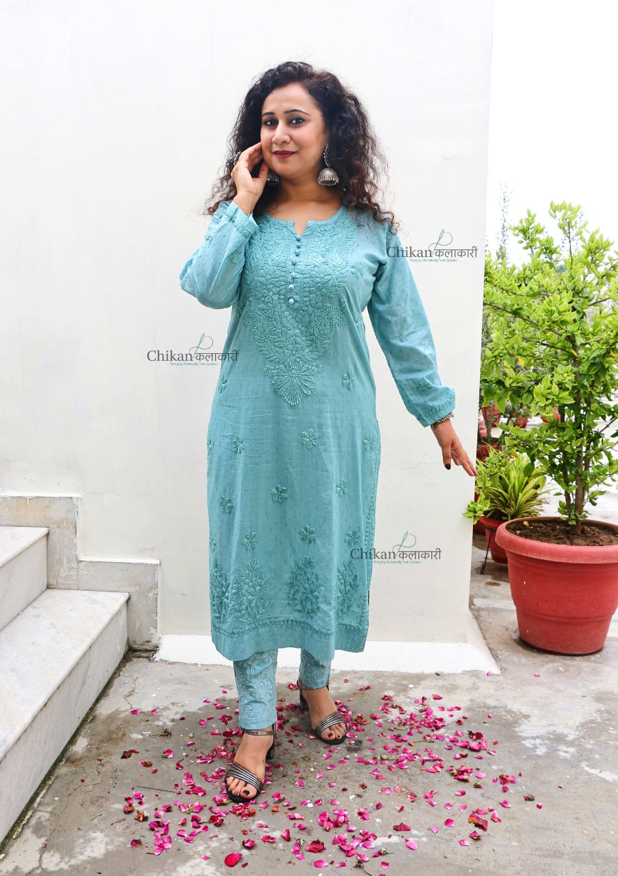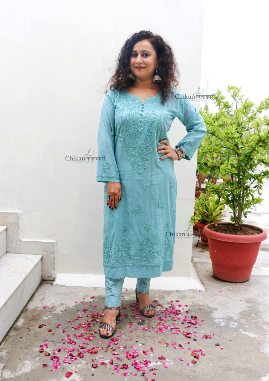 Discover the elegance and comfort of our Mahira Cotton Chikankari Kurti Set. Made with soft and lightweight dobby cotton fabric, this set features intricate hand embroidery on the kurti. To complete the look, matching chikankari pants are included. This timeless chikankari set is a favorite among influencers. A wardrobe must-have!