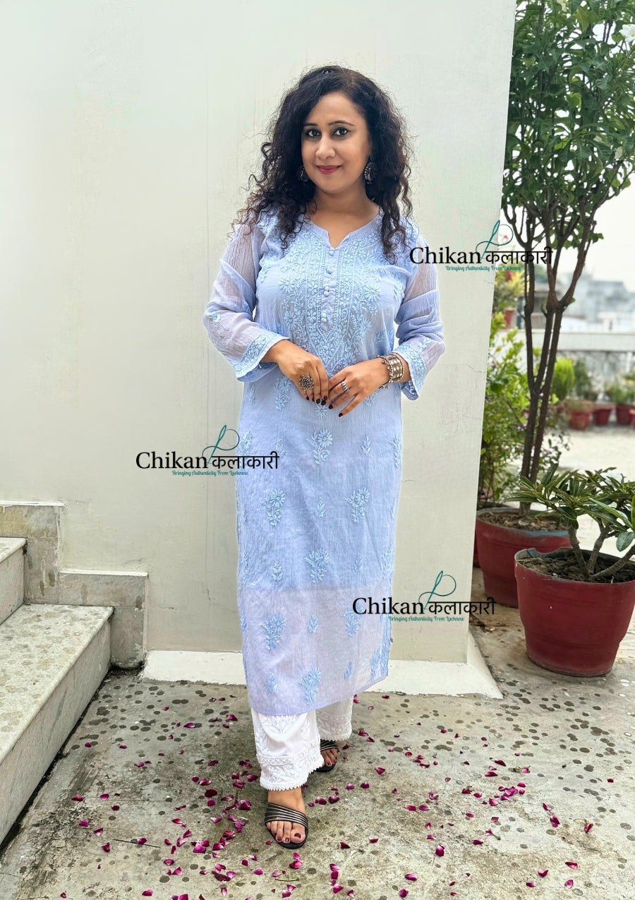 Style Tip: Pair Mannat Mul Chanderi chikankari kurti with Jenna Cotton Chikankari Palazzo. Add silver statement earrings to steal the limelight.