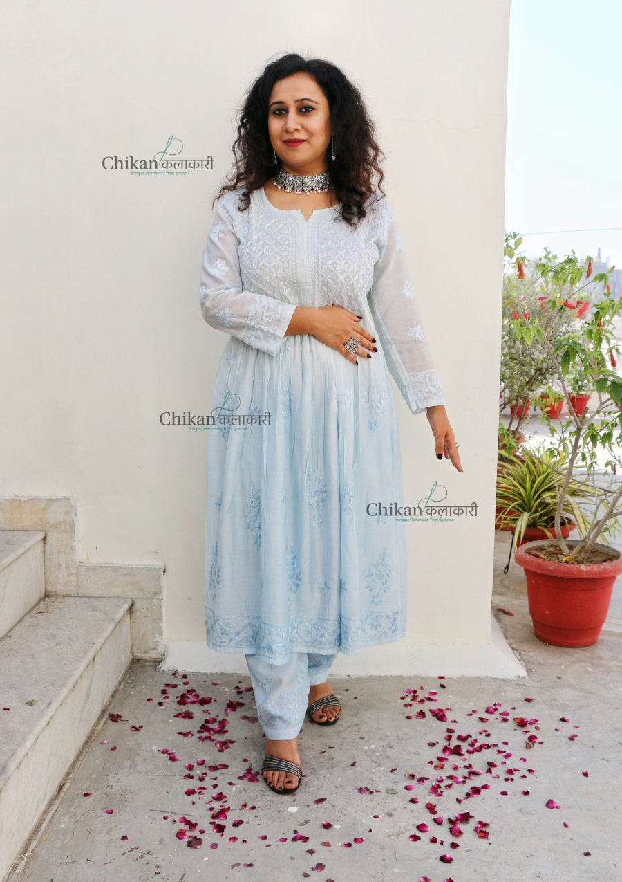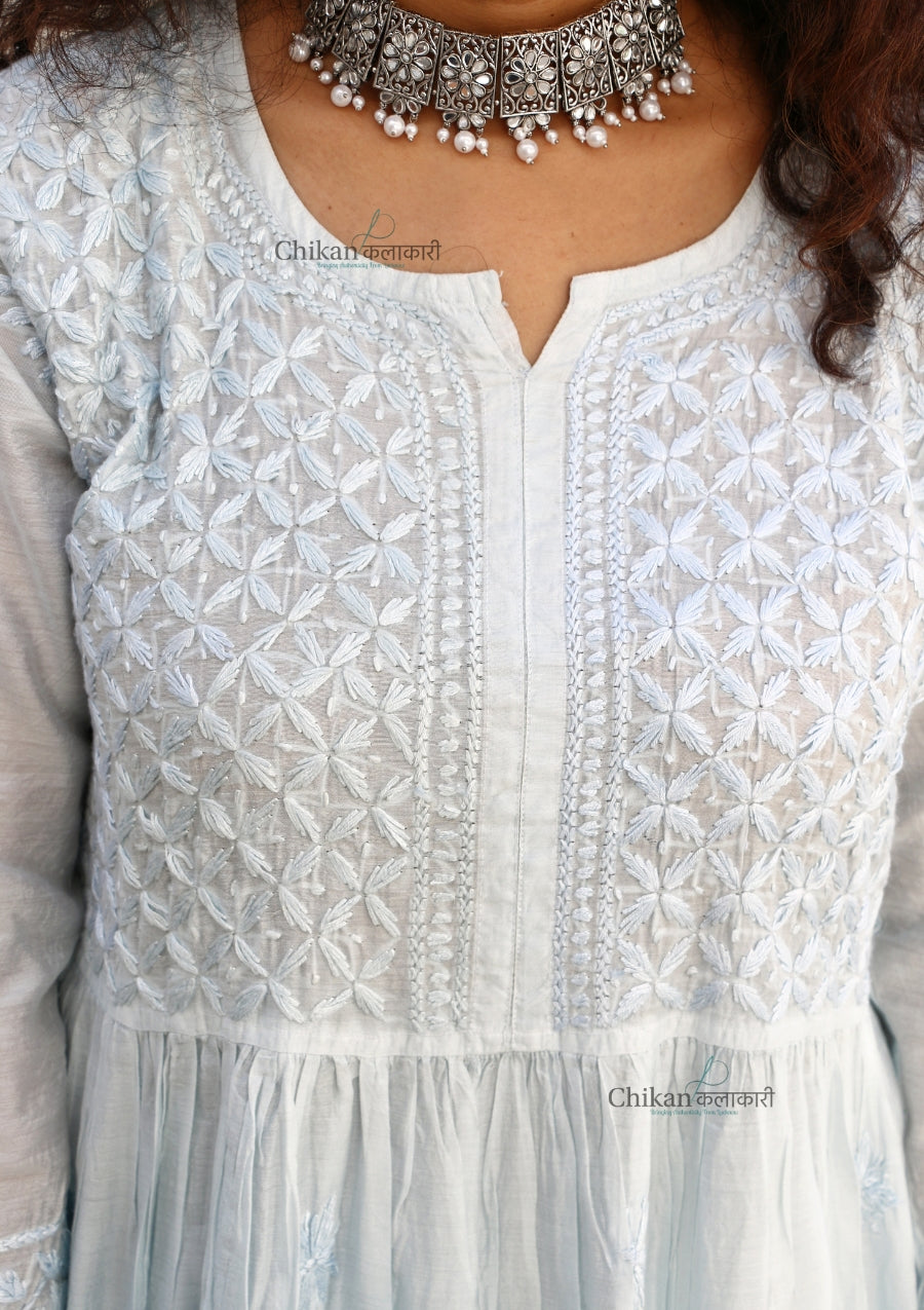 Experience luxury with the Noura Blue Chanderi Chikankari Gown Set. Crafted from rich Chanderi fabric, this exquisite kurti showcases detailed hand embroidery and a stunning steel blue hue. Elevate your fashion with this refined and stylish ensemble. Be ready to steal the spotlight at your next event with this elegant piece. It is an absolute must-have for your wardrobe.