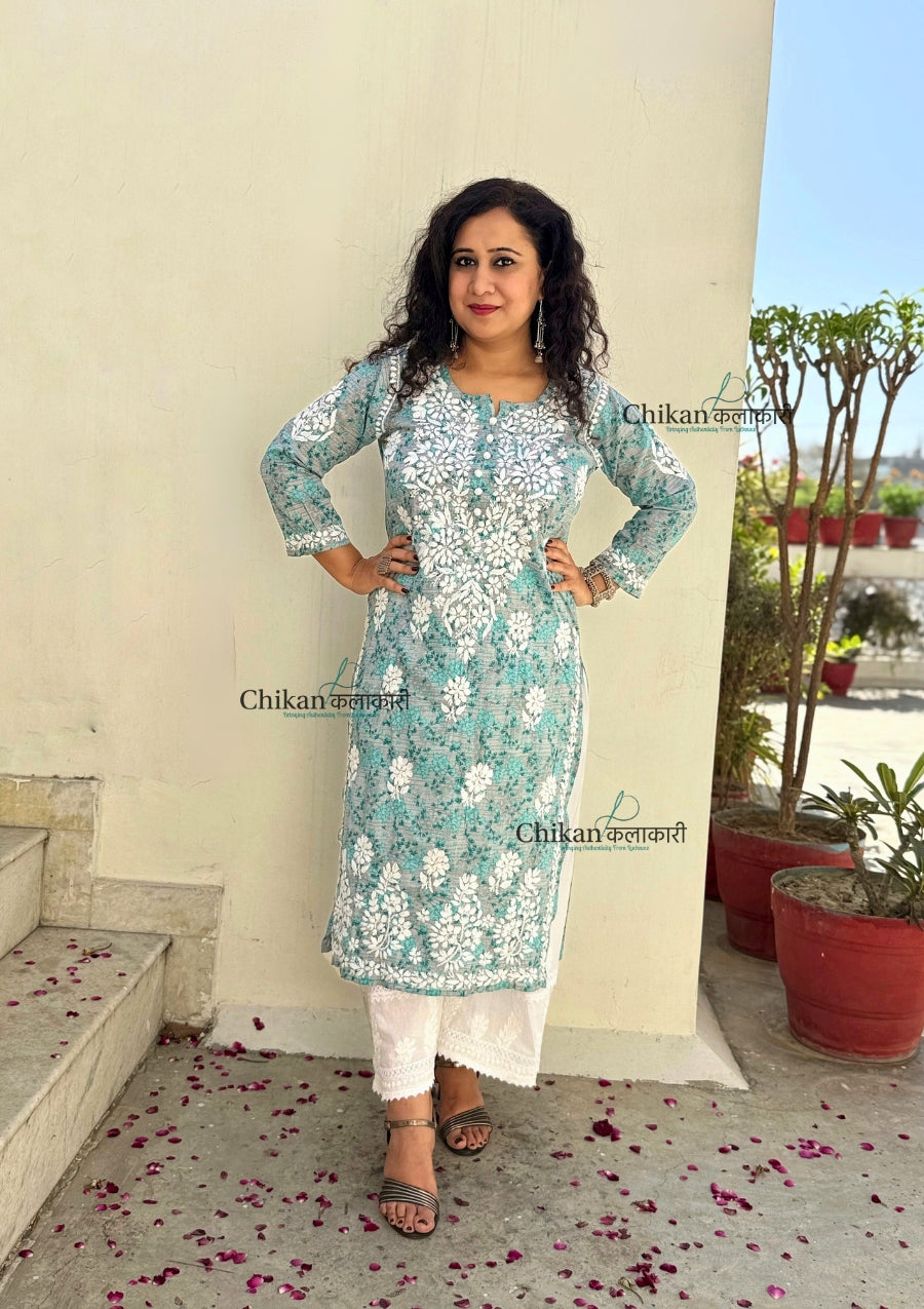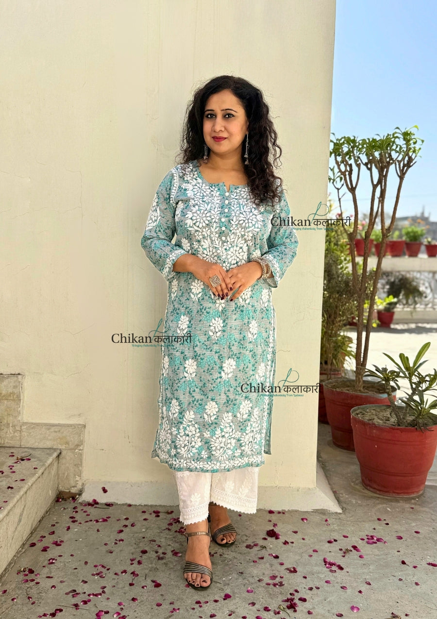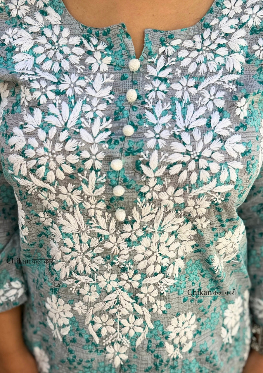 Expertly crafted with premium mul cotton fabric, this Palak Grey Mulmul Chikankari kurti is adorned with a beautiful print and features heavy 3D hand embroidery. Elevate your style with this must-have piece. Made with high-quality Mul cotton for a comfortable and stylish look.