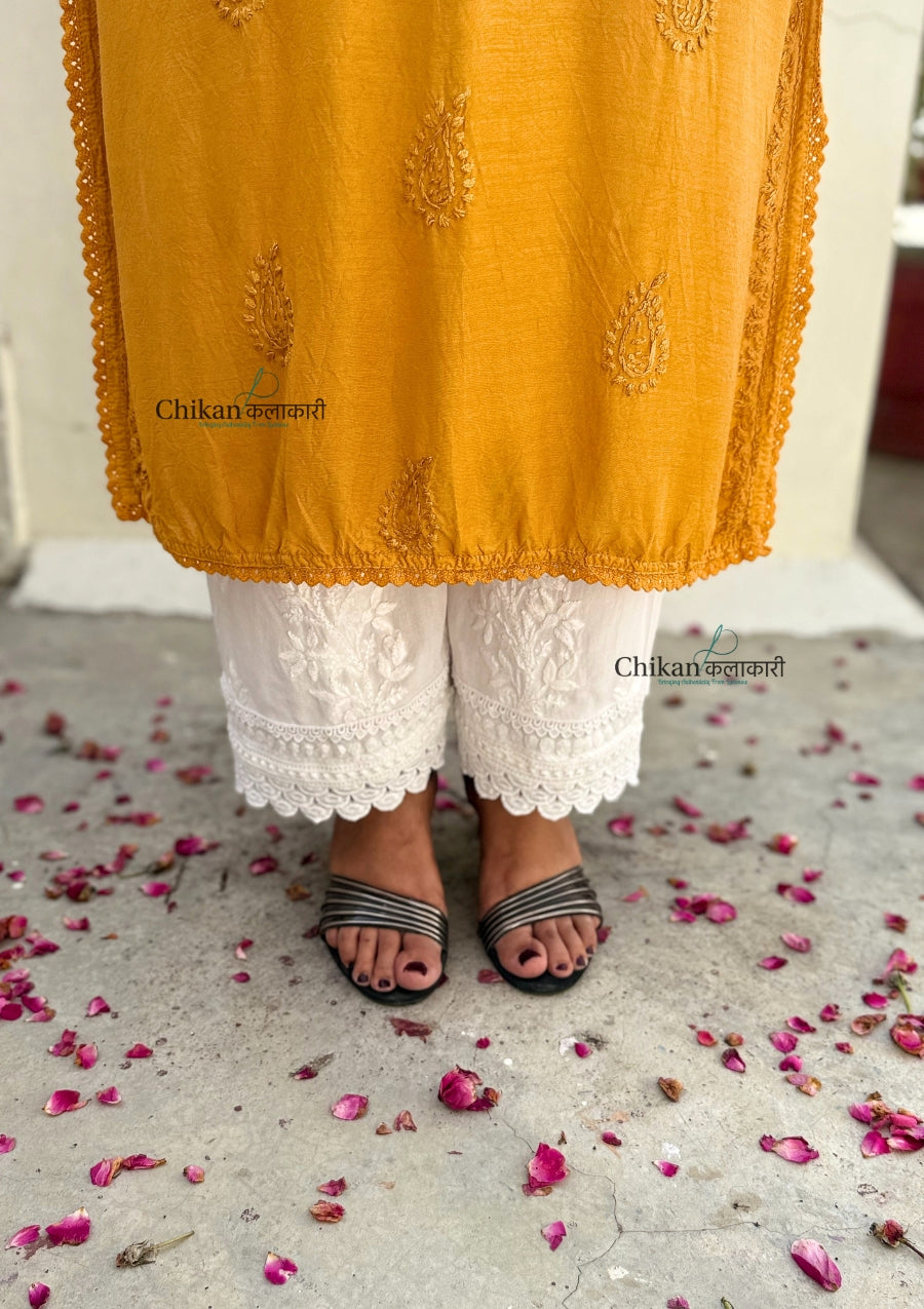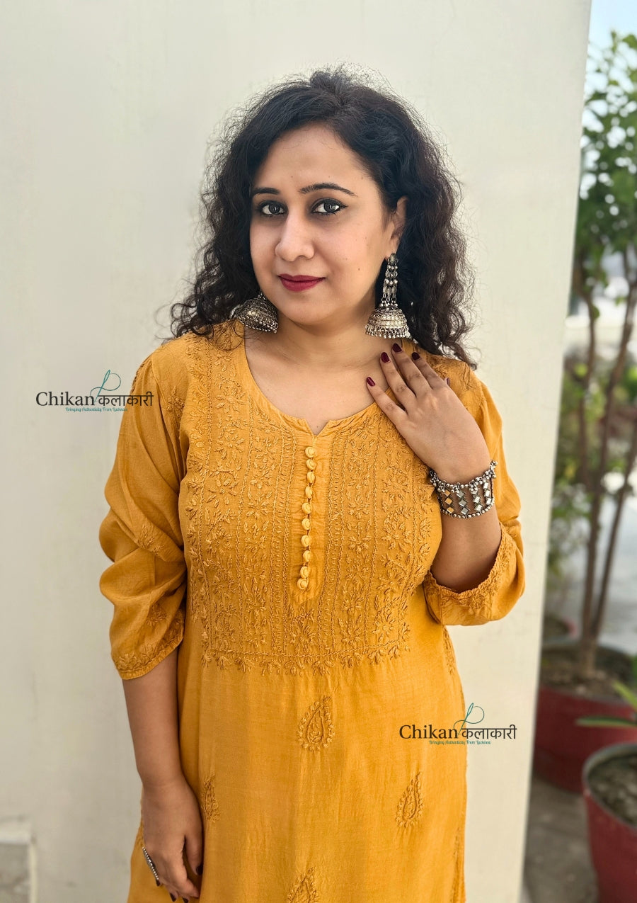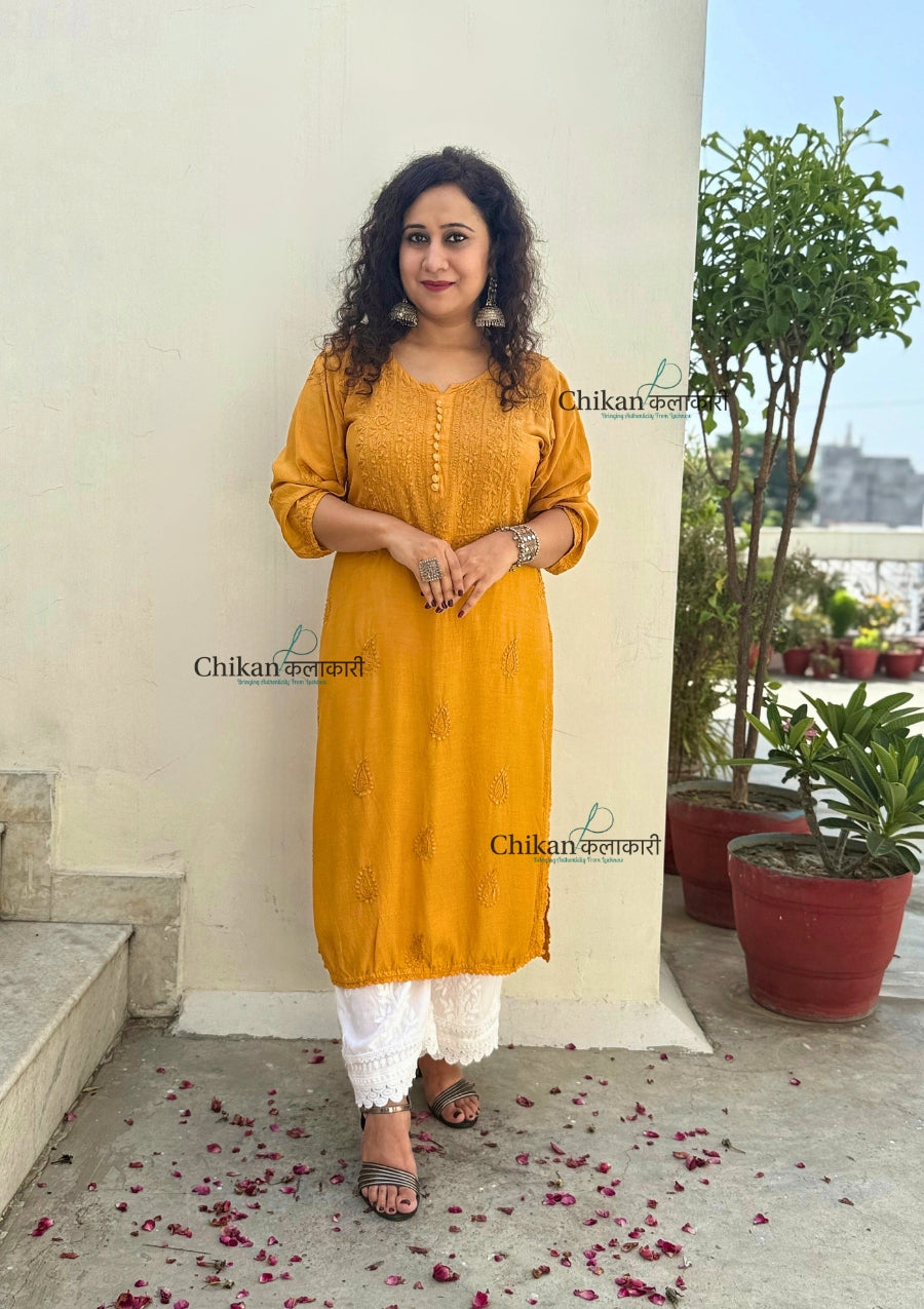 Rida Muslin Chikankari Kurti is a timeless classic designed from muslin cotton fabric for a luxuriously soft feel. Its beautiful hand embroidery and gorgeous color make it the perfect pick for any occasion. This hand-embroidered chikankari kurti with delicate lace details embodies timeless grace and modern charm.