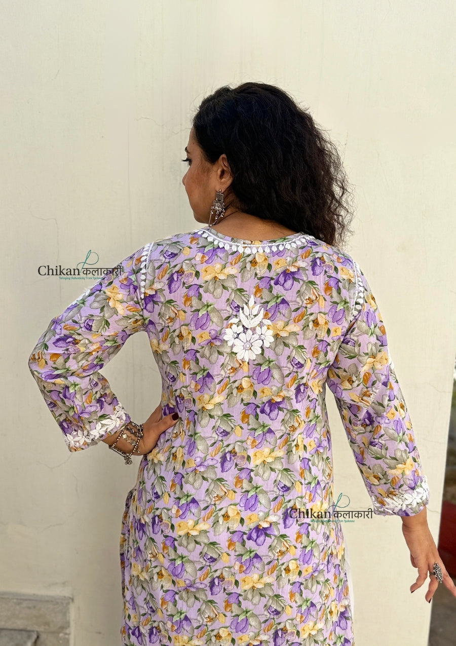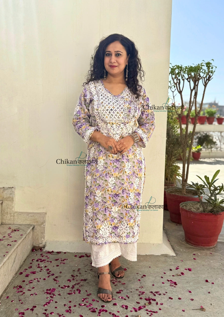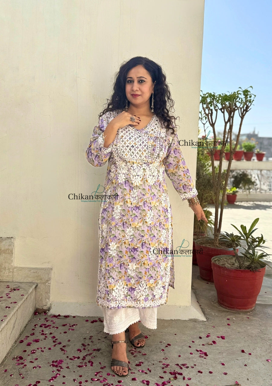 Sadaf Mul Cotton Chikankari kurti is expertly crafted with premium mul cotton fabric, adorned with a beautiful print, and meticulously hand-embroidered. Experience the luxurious feel of the fabric and the intricate details of the heavy hand embroidery, making it a perfect addition to your wardrobe. Elevate your style with this must-have piece.