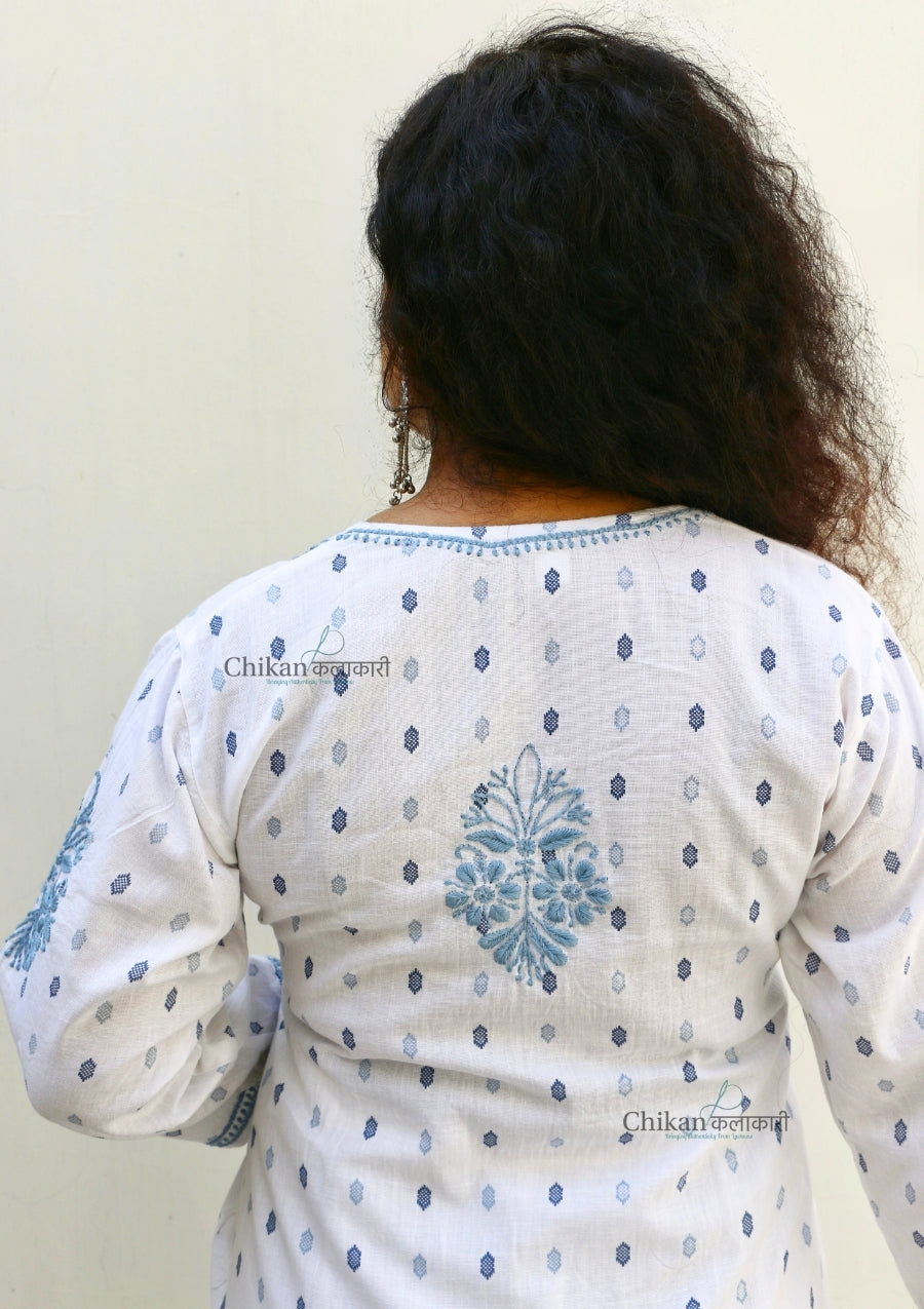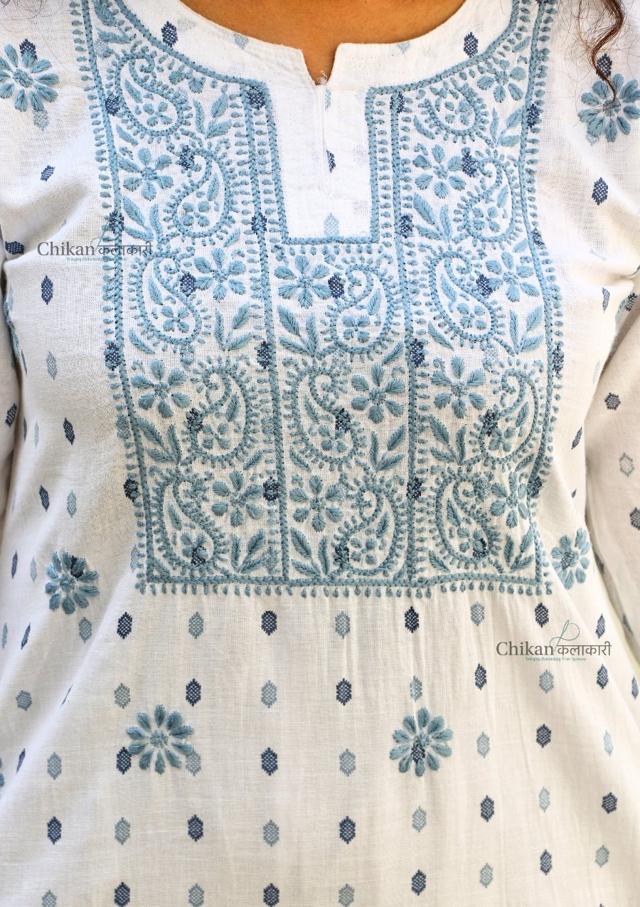 Effortlessly exude a chic vibe in Safa White Chikankari Kurti, made with Khadi Cotton. This elegant Lucknowi Chikankari kurti features hand embroidery, offering a modern look and all-day comfort. Elevate your wardrobe with this must-have Lucknowi Chikankari Kurti. Perfect for office wear, daily wear, and occasion wear.