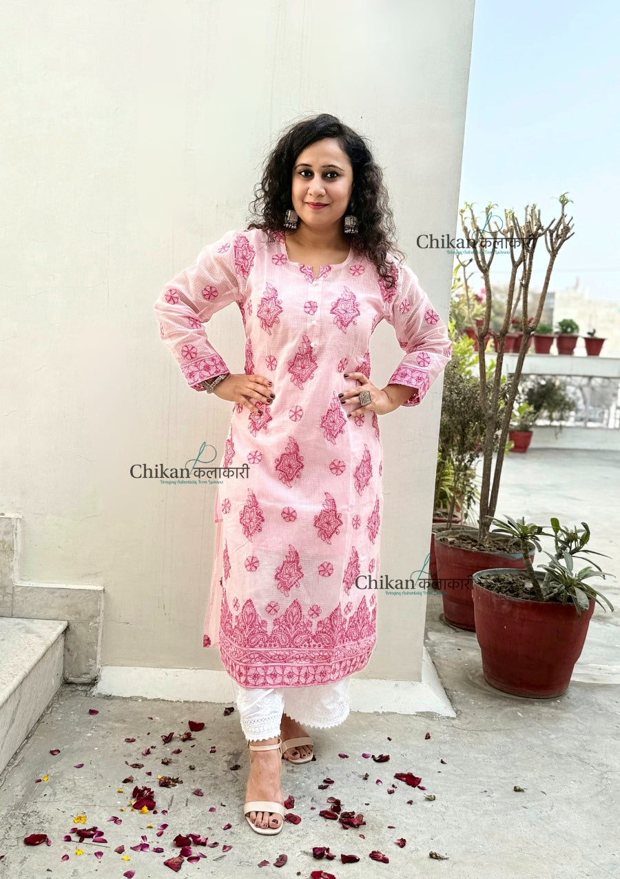 Experience luxury and elegance with our Sazia Chikankari Premium Kota Kurti. Made from high-quality Kota Doria fabric and hand-embroidered with intricate details, this chikankari kurti exudes sophistication. Comes with a matching inner for a complete and elegant look. Elevate your wardrobe with this premium Chikankari Kota Kurti and make a statement wherever you go.