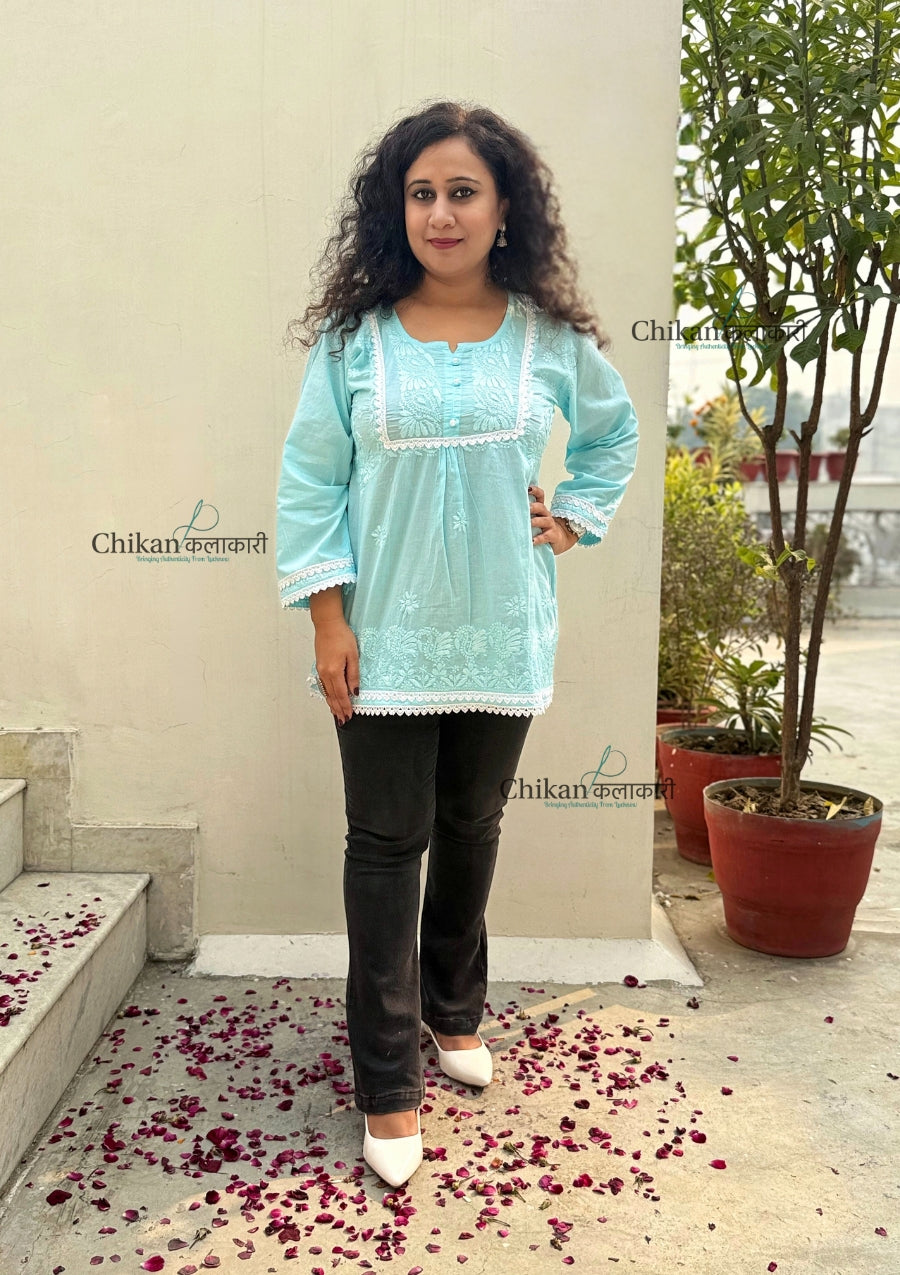 Elevate your closet with our Shanaya Short Chikankari Kurti, crafted from soft, breathable mulmul fabric. This designer piece showcases exquisite chikankari hand embroidery and lace details, offering a refined touch to your style. Experience both comfort and sophistication in this graceful chikankari kurti.