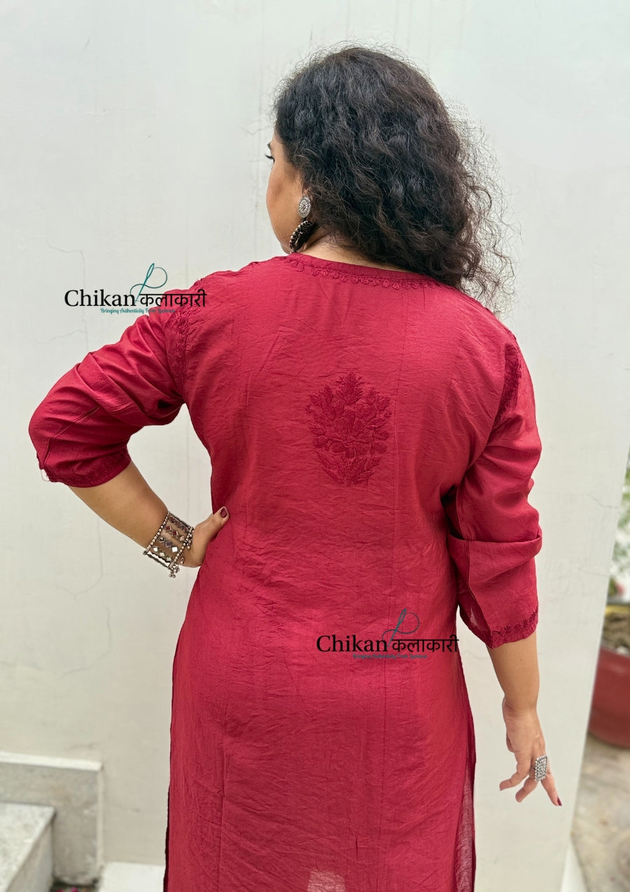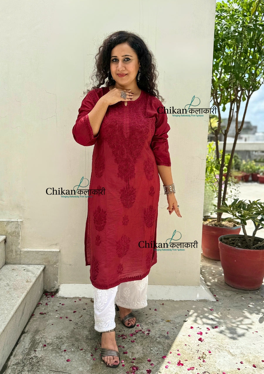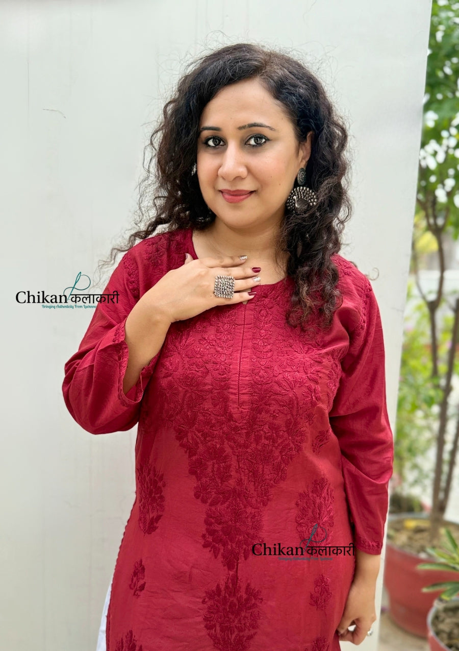 Indulge in luxury with Sitara Chanderi Chikankari Kurti. Made from luxurious Chanderi fabric, this charming kurti features intricate chikankari hand embroidery and rich shine. Elevate your style game with this elegant and sophisticated piece.