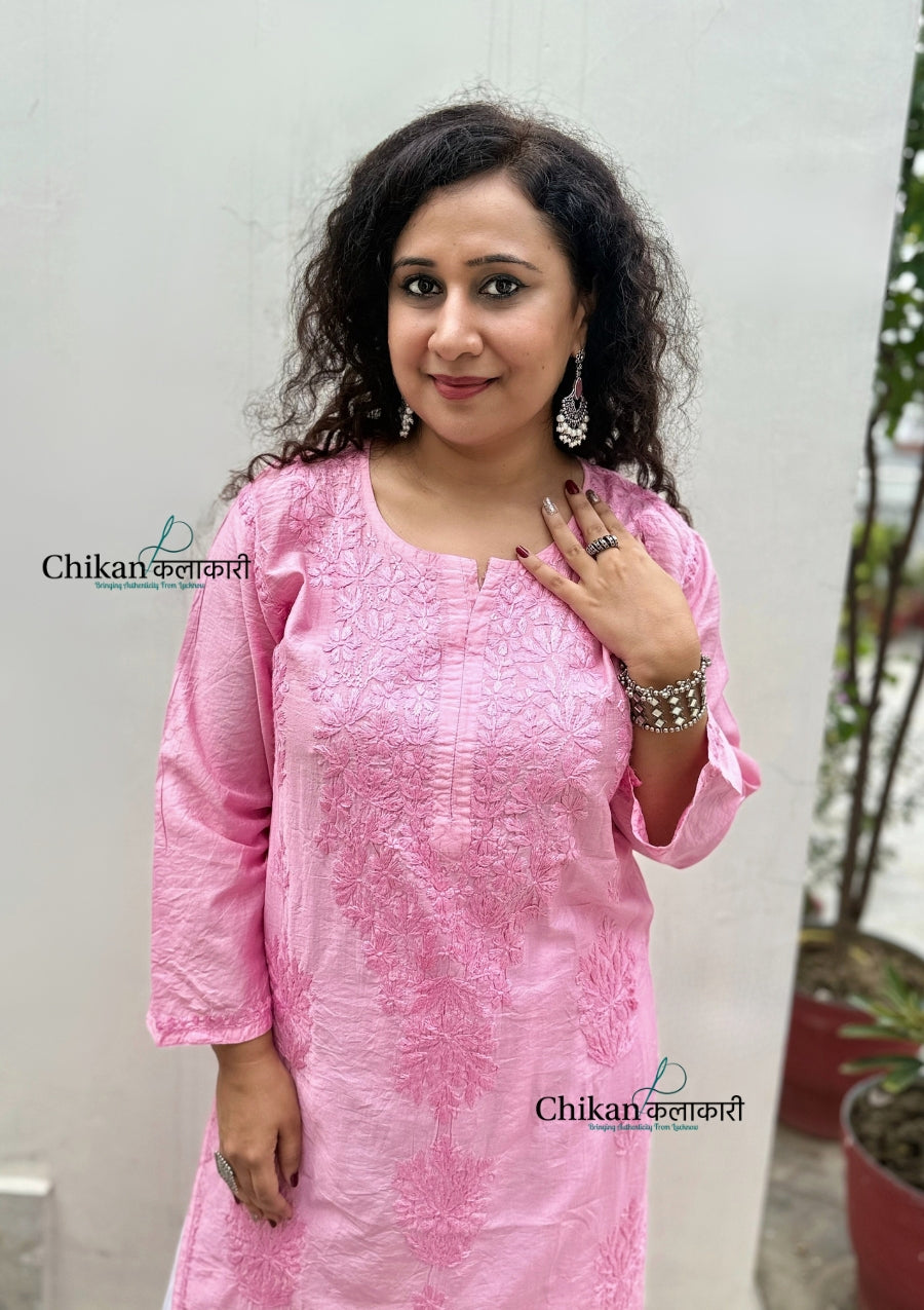 Indulge in luxury with Sitara Chanderi Chikankari Kurti. Made from luxurious Chanderi fabric, this charming kurti features intricate chikankari hand embroidery and rich shine. Elevate your style game with this elegant and sophisticated piece.