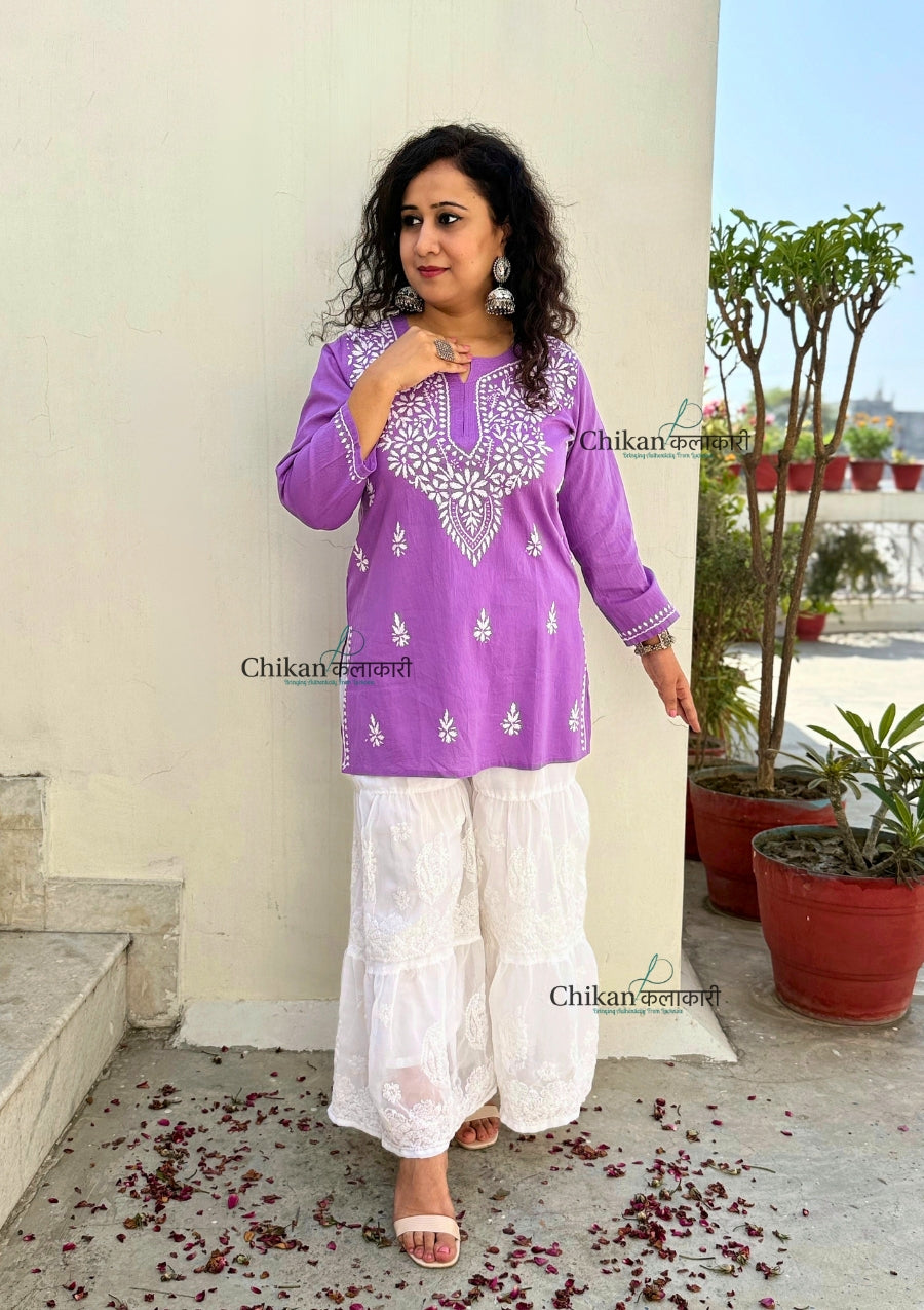Enhance your wardrobe with our Tia Short Chikankari Kurti, made from soft and breathable cotton fabric. This wardrobe staple features intricate hand chikankari embroidery, adding a touch of elegance to your style. Stay comfortable and stylish in this classic short chikankari kurti.