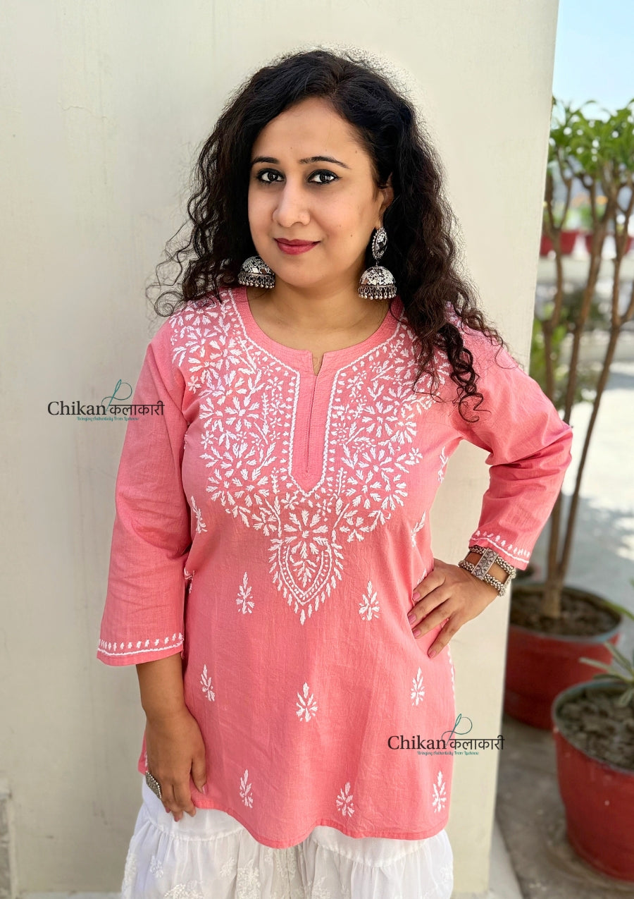 Enhance your wardrobe with our Tia Short Chikankari Kurti, made from soft and breathable cotton fabric. This wardrobe staple features intricate hand chikankari embroidery, adding a touch of elegance to your style. Stay comfortable and stylish in this classic short chikankari kurti.