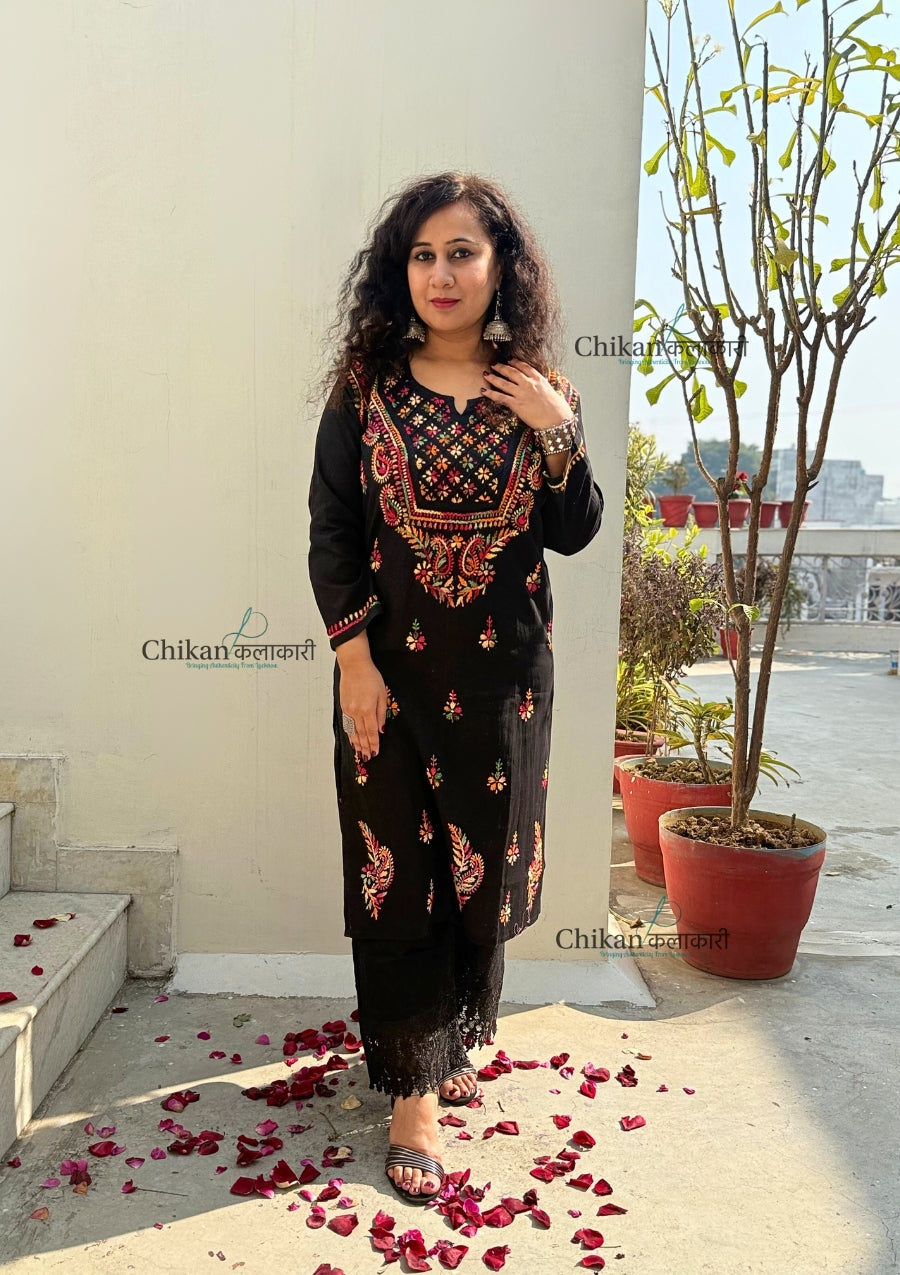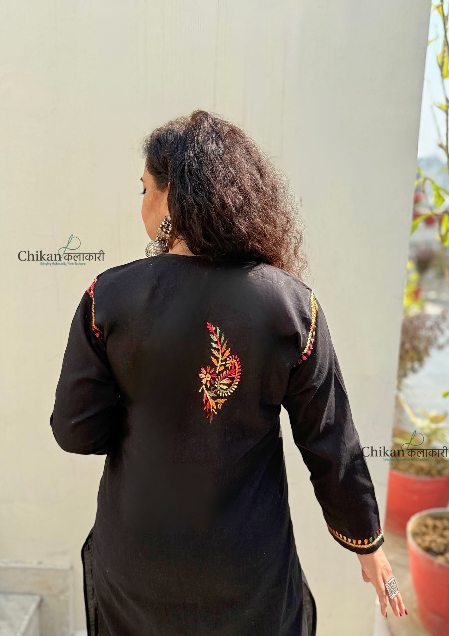 Look effortlessly cool and chic in Trish Pure Cotton Black Chikankari Kurti. Crafted with soft cotton and detailed with multi-colored hand-embroidered chikankari, this piece will look beautiful and graceful. The lightweight fabric is both comfortable and breathable for all-day wear. Show off your unique fashion sense with this timeless wardrobe staple!