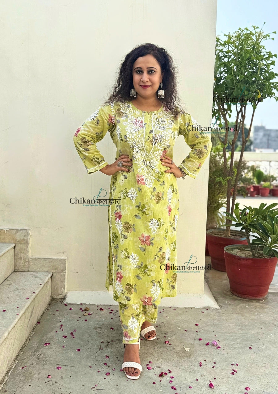 Vaani Mulmul Chikankari Kurti Set showcases intricate Chikankari hand embroidery on premium pure mulmul fabric. The chikankari set features a beautiful summer floral print complemented by intricate hand embroidery. The lightweight, breathable fabric ensures optimal comfort throughout the day.
