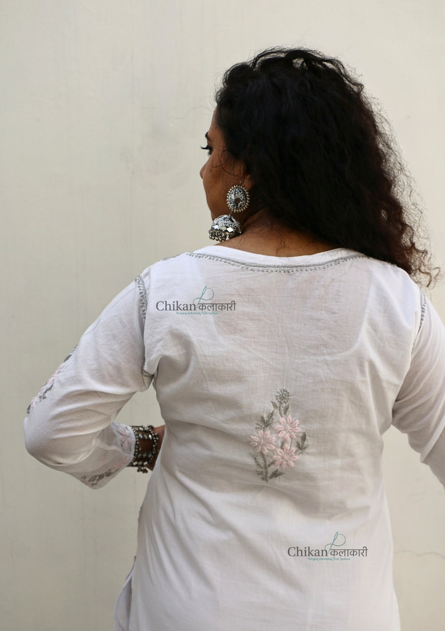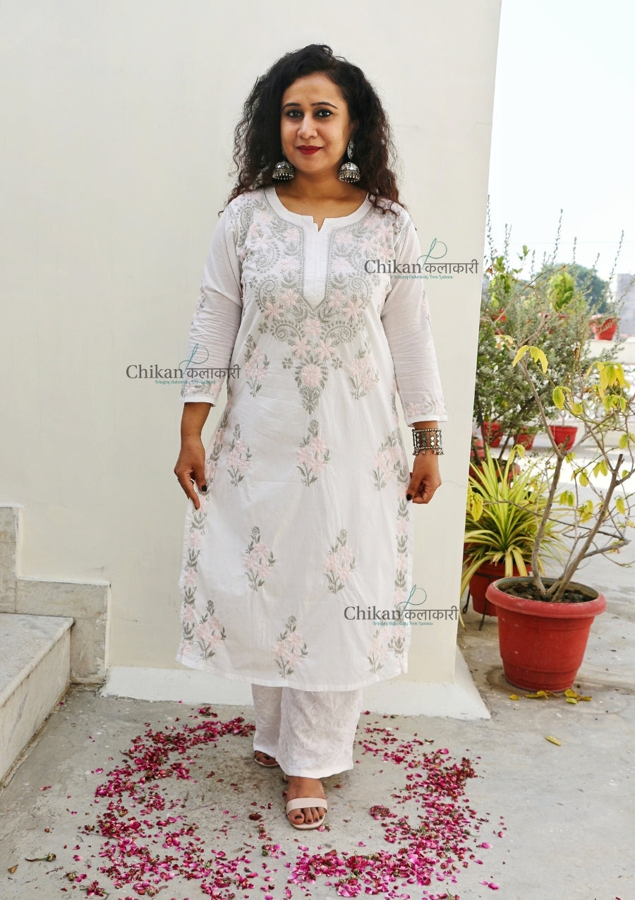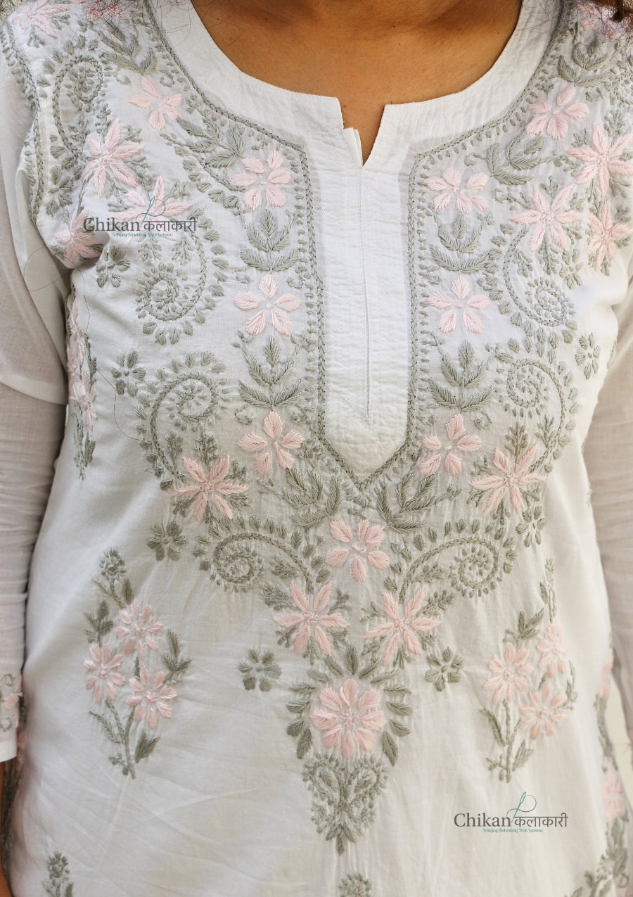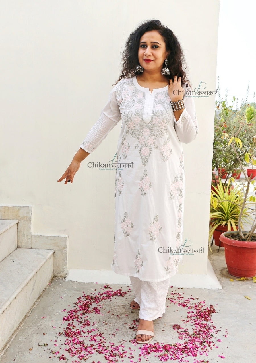 Look effortlessly cool and chic in Zareen Mulmul White Chikankari Kurti. Crafted with soft mulmul fabric and detailed with pink and grey colored hand embroidery, this white Chikankari Kurti looks graceful and stylish. The lightweight fabric is both comfortable and breathable for all-day wear. Show off your smart fashion sense with this gorgeous Lucknowi Chikankari white kurta!