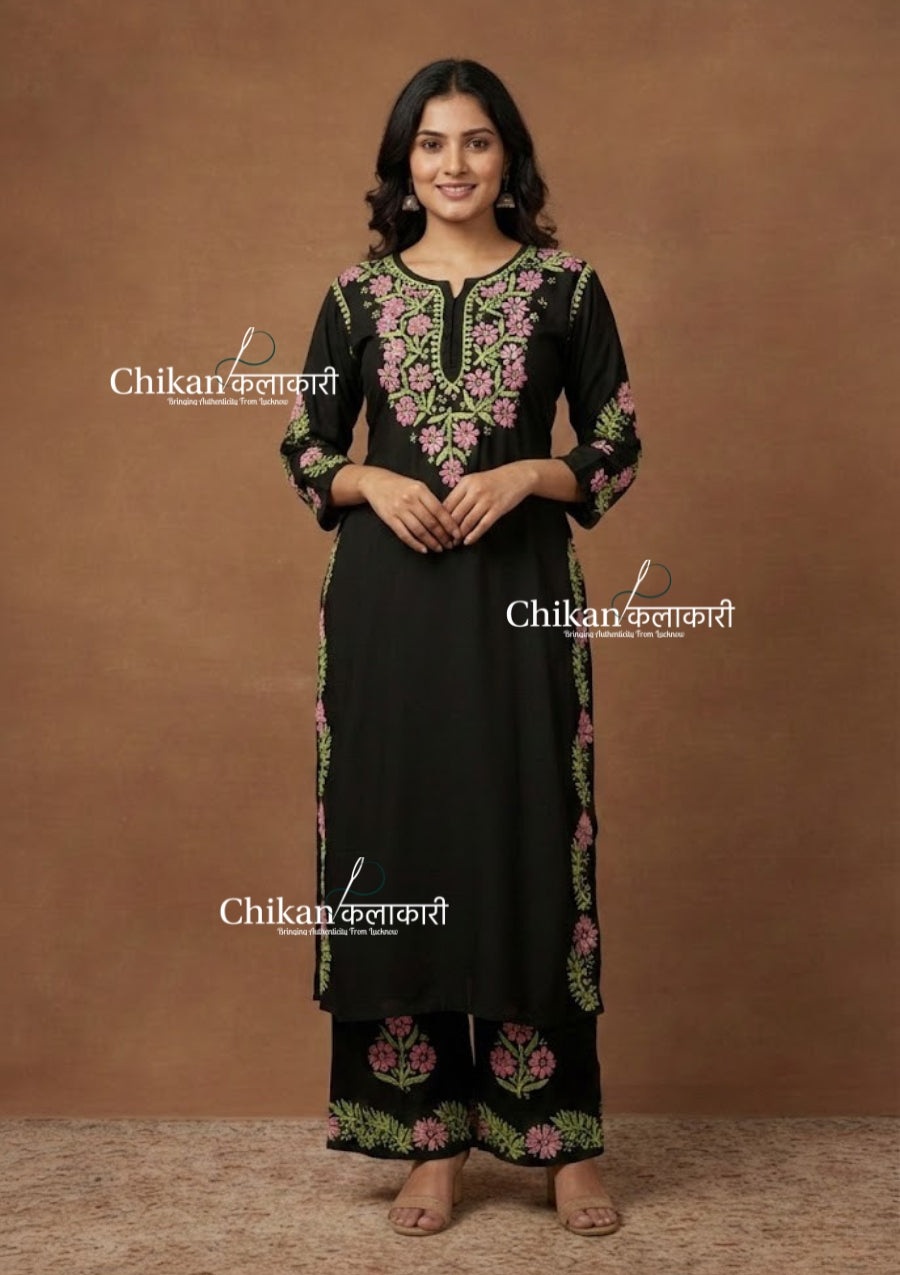Ziva Rayon Chikankari Kurti Set is a beautiful 2 pc set crafted with expert craftsmanship. It's produced using premium rayon fabric for effortless breathability and comfort. The attractive 2 color Chikankari embroidery add a graceful finishing touch for an elegant style. Perfect for both office wear and special occasions.